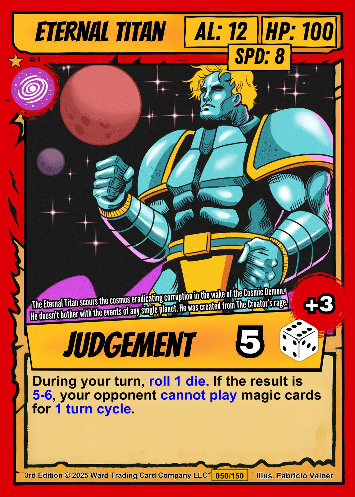 Additionally, pink and purple planets drift across the starry black void behind the armored figure. The bright yellow border frames red stat boxes displaying AL: 12, HP: 100, and SPD: 8. Meanwhile, the bottom text box reveals the JUDGMENT ability with dice mechanics.