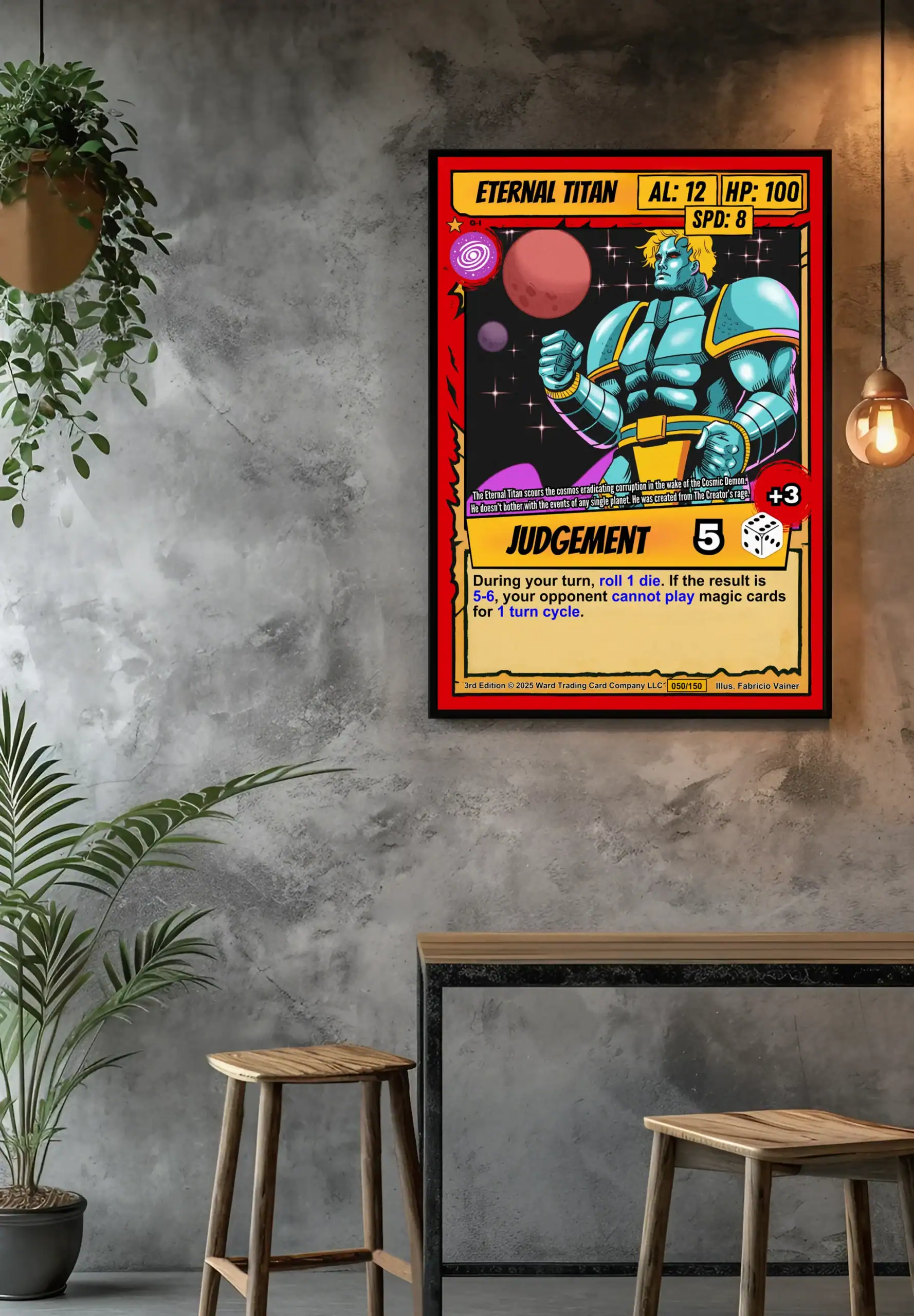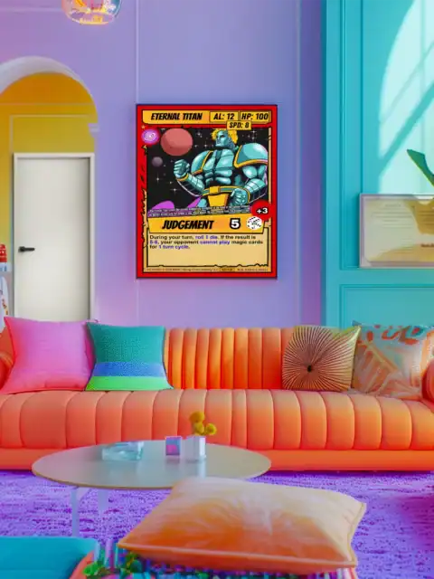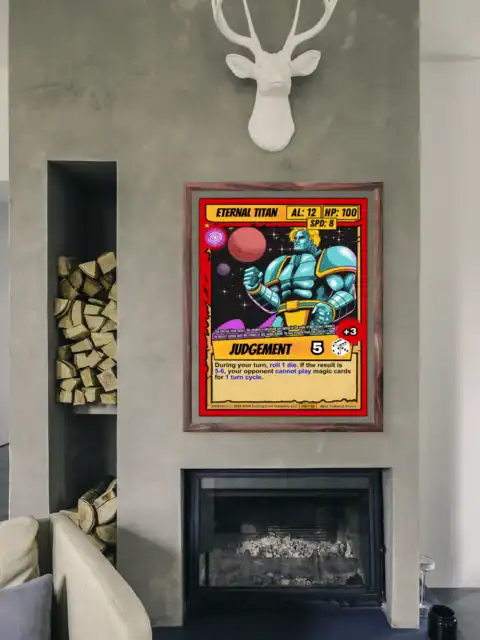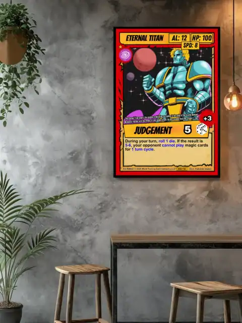 Canvas preserves every sharp line and vibrant color that screens wash out. TCG collectors and sci-fi art enthusiasts recognize authentic 90s comic book styling instantly. Moreover, this eternal titan trading card canvas print commands respect in any collection space.