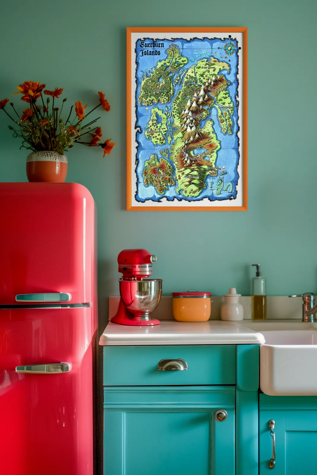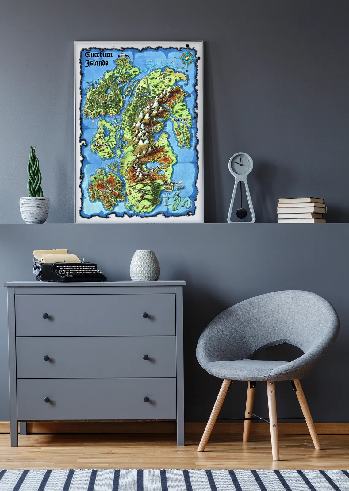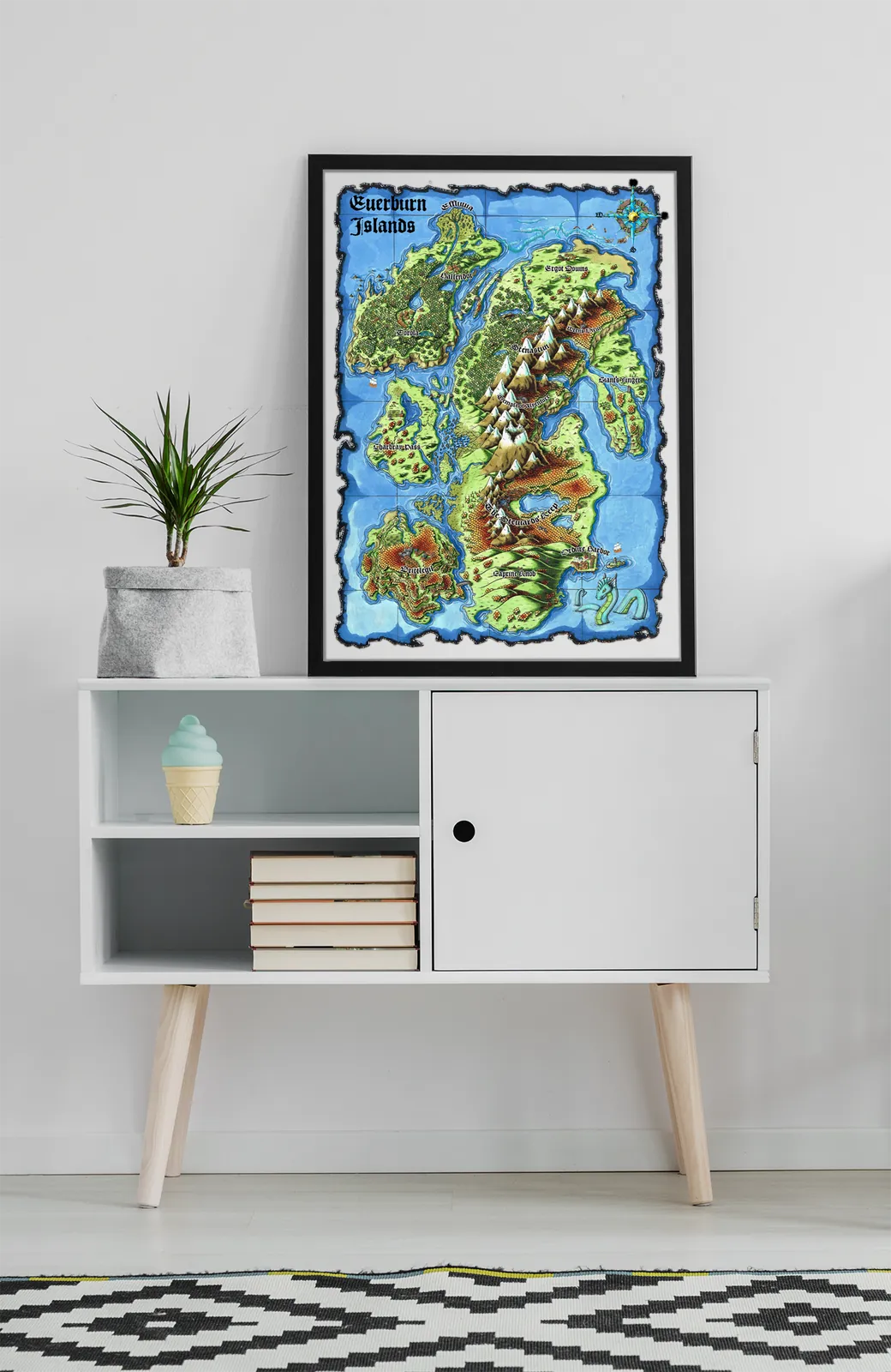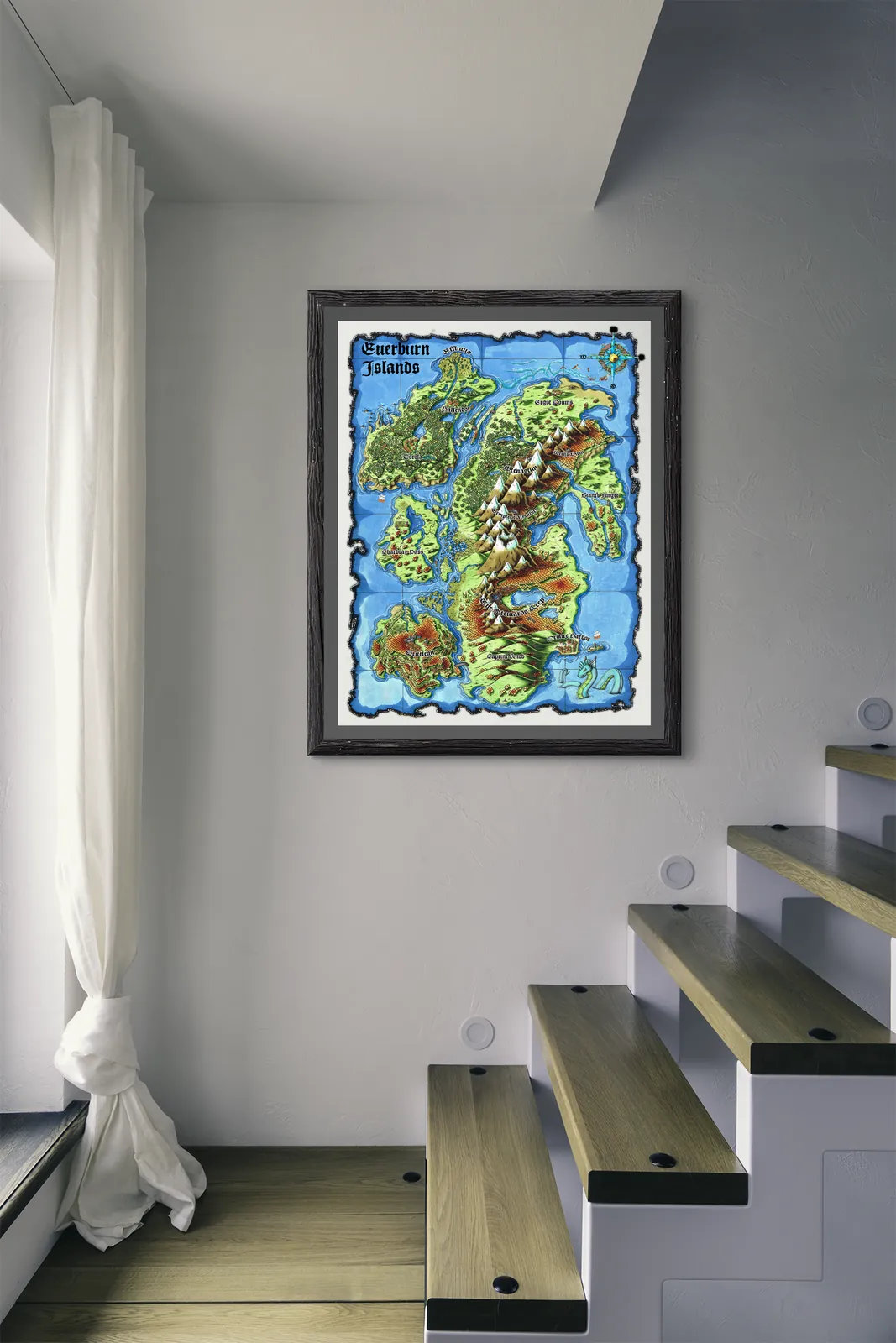 Everburn Islands Map Fantasy Art Print by Deven Rue introduces the Everburn Islands canvas map as a volatile archipelago shaped by fire, mountains, and restless seas. Moreover, the region feels inherently dangerous, with volcanic ridges and fractured coastlines implying constant upheaval. Strategic threat emerges from terrain itself, where survival depends on understanding land and water.
