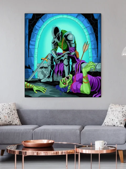 A defeated knight slumps on rubble beside a slain green-skinned creature. This exhaustion art trading card art canvas print captures Fabricio Vainer’s graphic novel rendering in full detail. The cyan portal glow specifically casts dramatic rim lighting across silver armor and purple robes.
