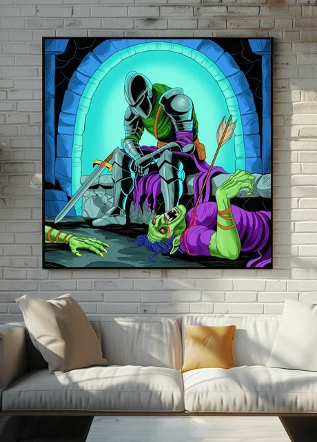 On the wall, the high-contrast cel-shading holds intensity impossible at card scale. Ward TCG collectors and dark fantasy enthusiasts recognize Vainer’s graphic novel technique immediately. This exhaustion art trading card art canvas print delivers melancholic battle aftermath with gallery-ready clarity.