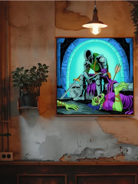 The contemplative mood suits game rooms where victory and consequence share equal wall space. Additionally, creative studios benefit from the bold linework and flat color approach as reference material.