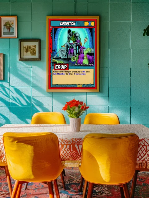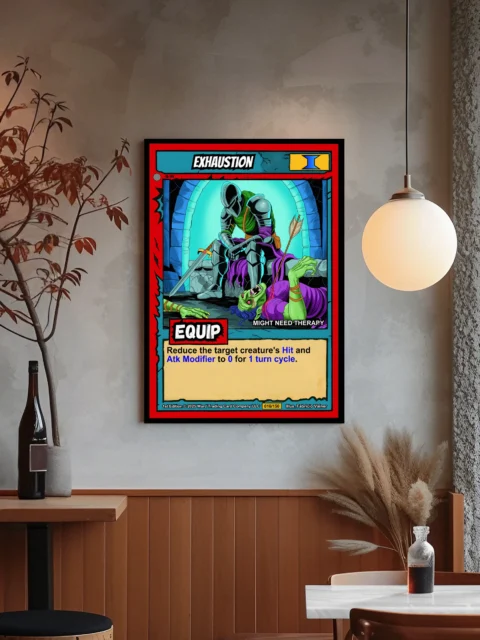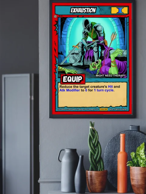 The comic book linework and saturated colors read clearly from across a room. Ward TCG collectors recognize the bold cel-shaded style immediately. This exhaustion trading card canvas print captures the card’s dramatic finish at full scale.