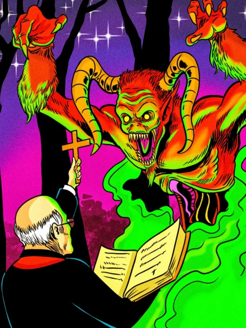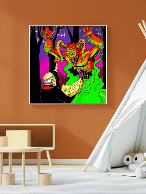An elderly priest holds a crucifix aloft, confronting a horned demon emerging from neon green ectoplasm. This exorcism art trading card art canvas print captures Fabricio Vainer’s retro horror illustration in full psychedelic intensity. Notably, the demon’s ram horns and rows of sharp teeth dominate the foreground.