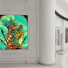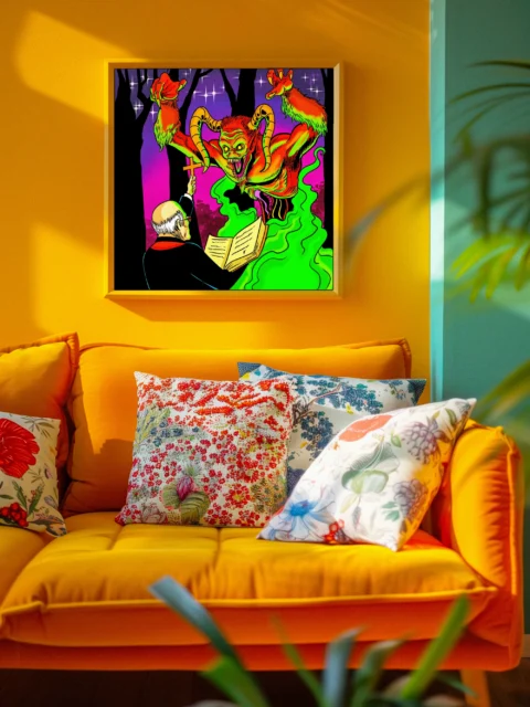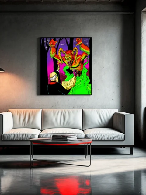 Display in a game room alongside other horror-themed TCG art or retro monster illustration collections. Additionally, the psychedelic color scheme complements creative studio spaces with bold visual energy.