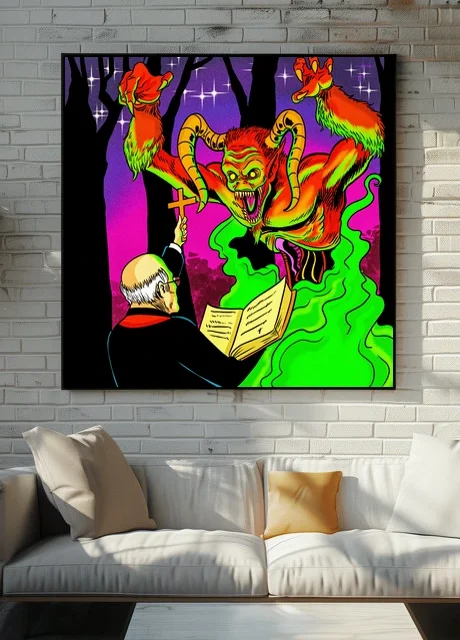 An elderly priest holds a crucifix aloft, confronting a horned demon emerging from neon green ectoplasm. This exorcism art trading card art canvas print captures Fabricio Vainer’s retro horror illustration in full psychedelic intensity. Notably, the demon’s ram horns and rows of sharp teeth dominate the foreground.