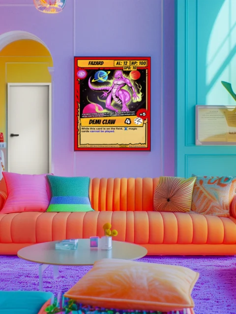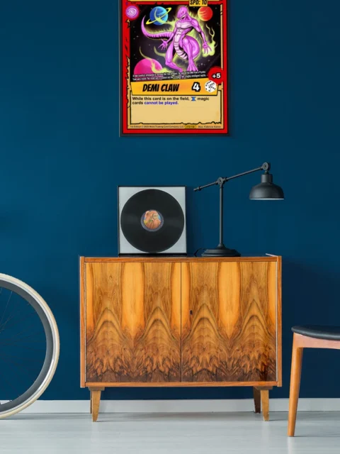 This works best in game rooms where the cosmic backdrop and vibrant character design hold attention. Additionally, the card’s stat layout provides visual structure that balances bolder wall arrangements.