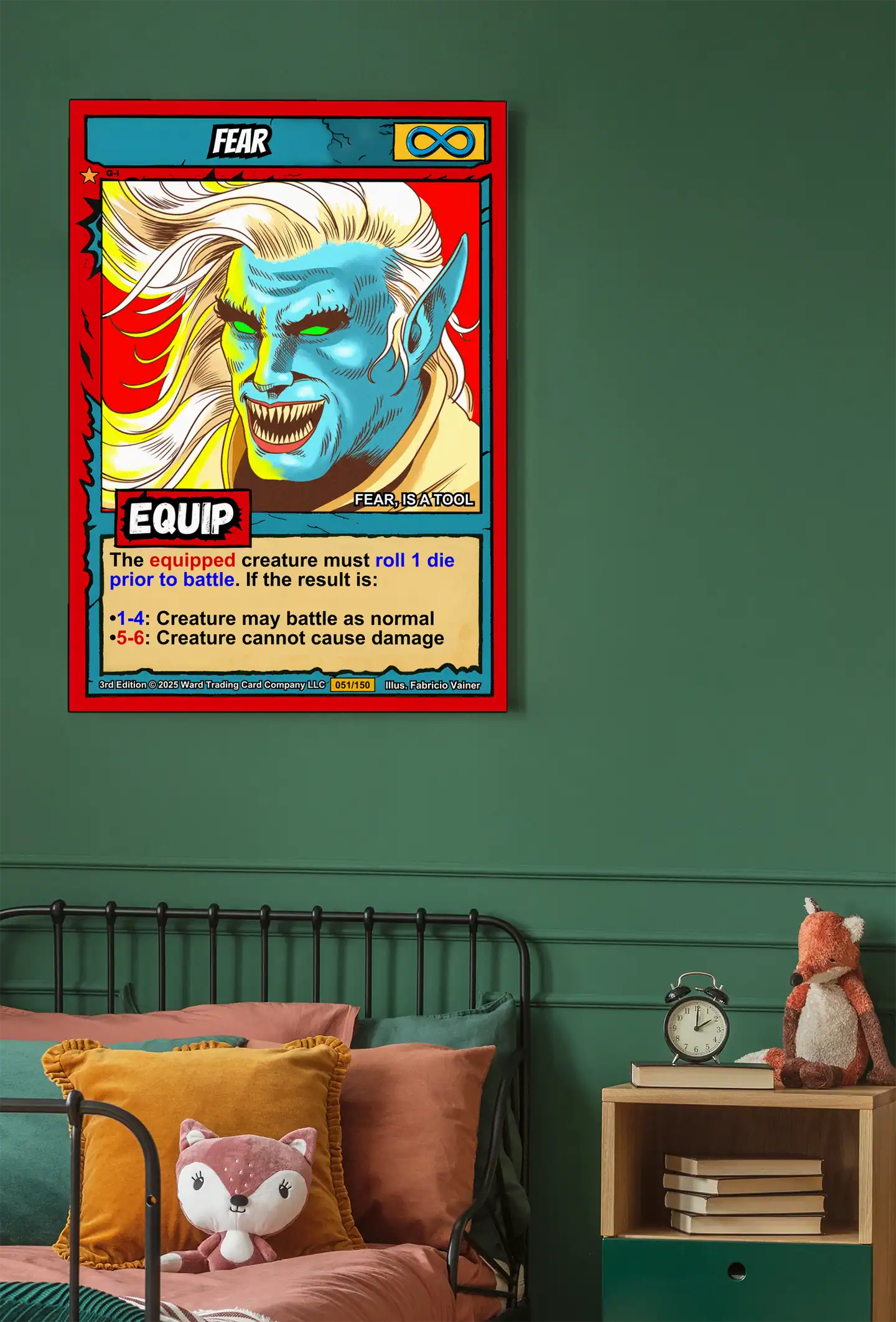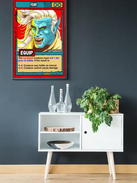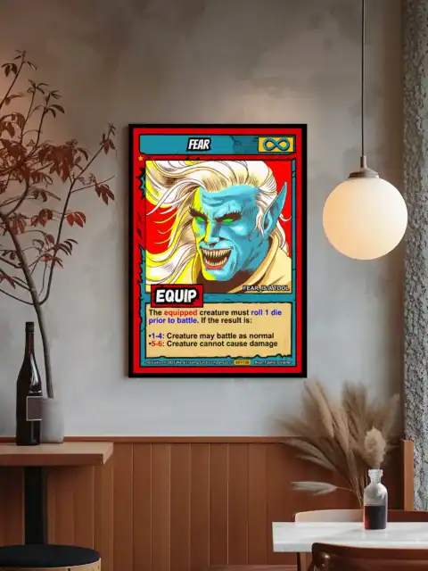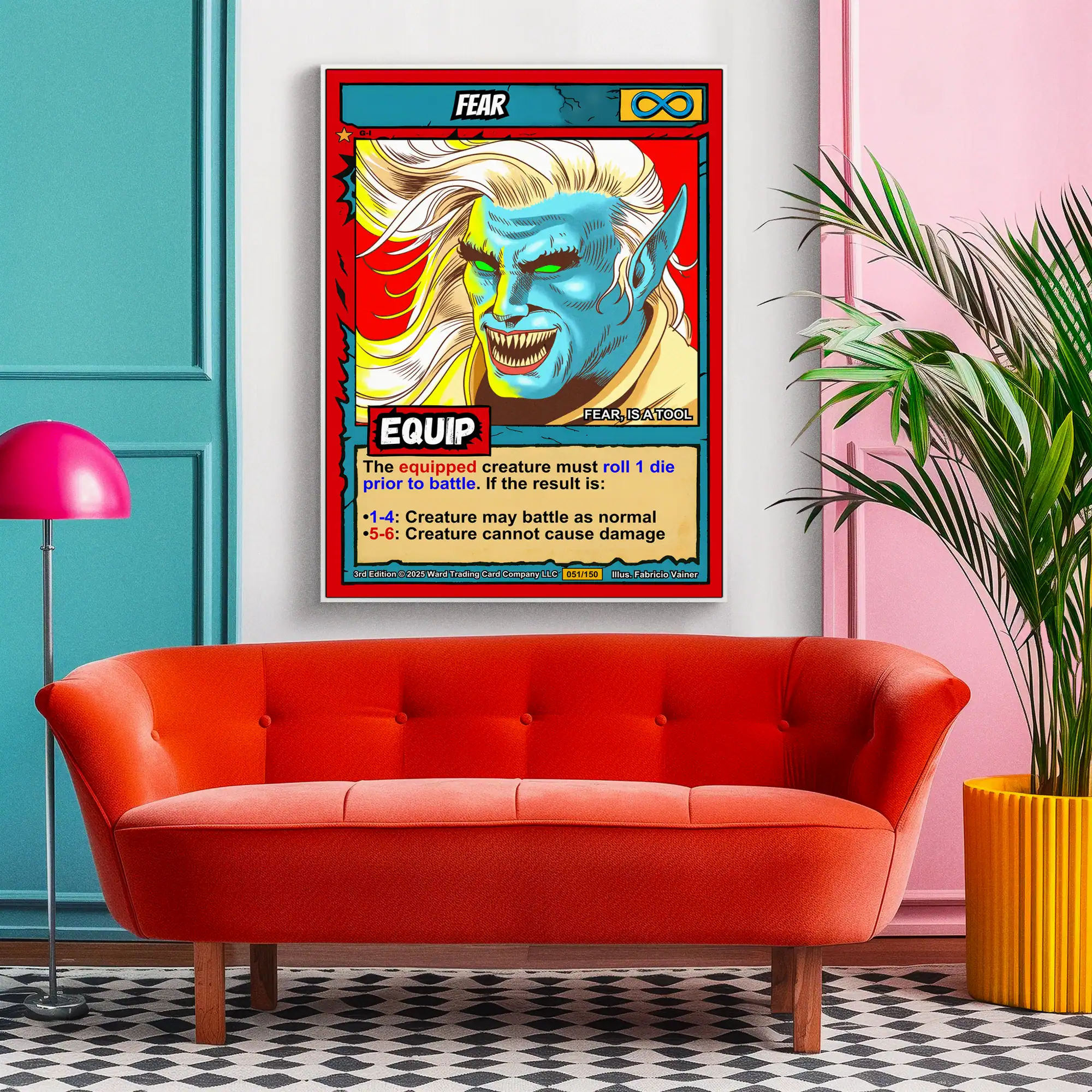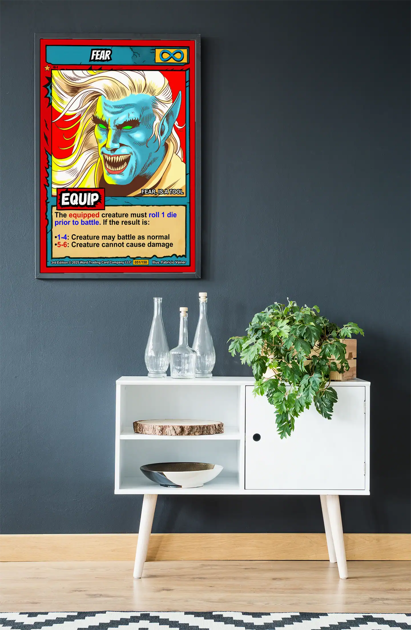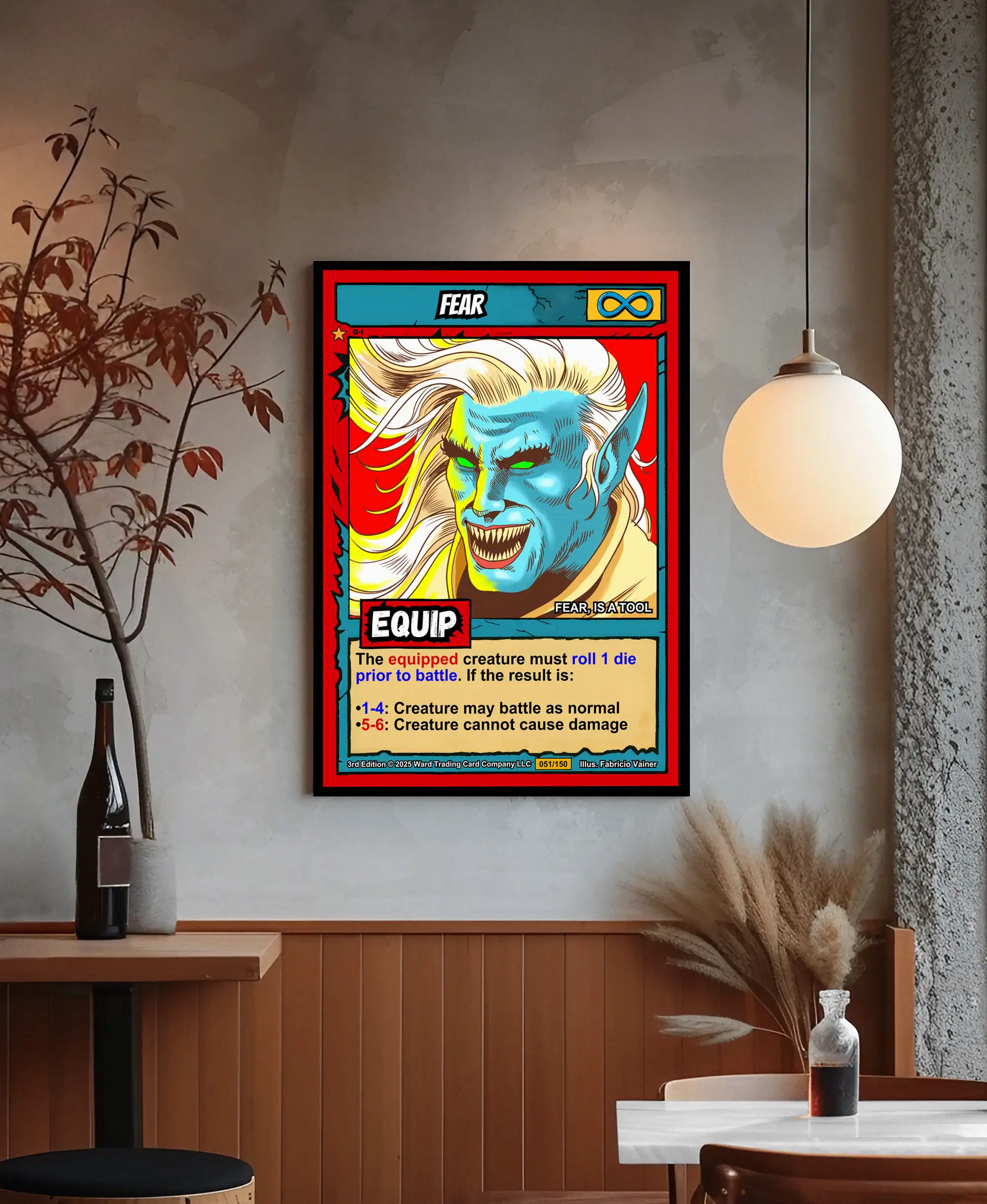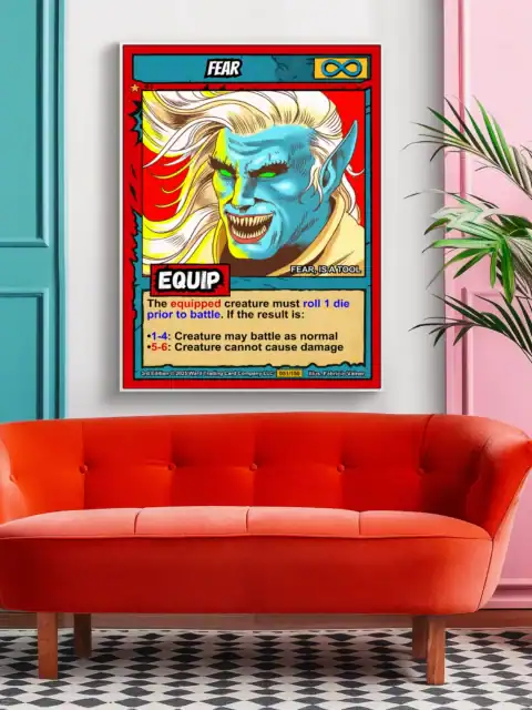That menacing grin reveals personality beyond typical fantasy monster art. TCG collectors recognize Vainer’s distinctive 90s comic book line work and cross-hatching. Particularly, this Fear trading card canvas print delivers the nostalgia serious collectors seek.