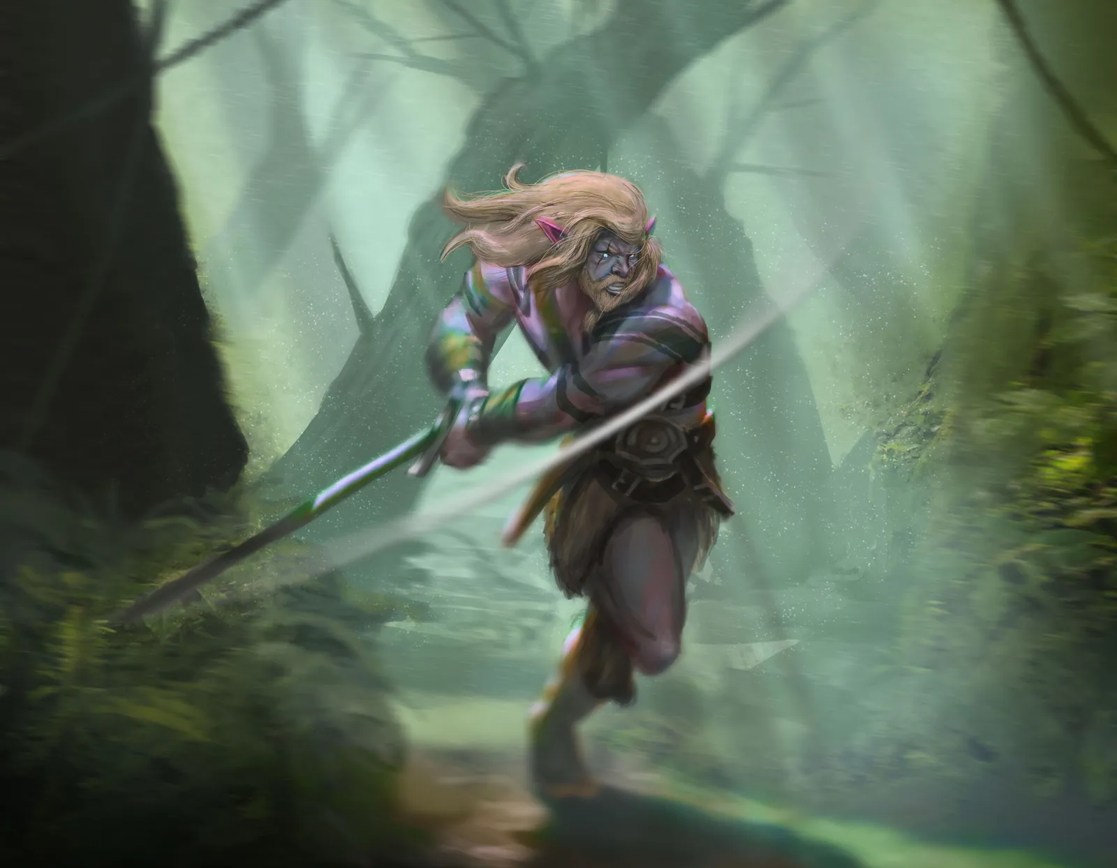 Additionally, the angled pose and wind-tossed hair push the eye forward through the woodland haze. However, the soft background keeps the fighter crisp and readable at a distance. Consequently, the image balances painterly atmosphere with decisive character detail.