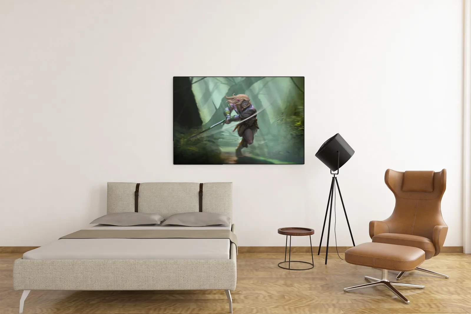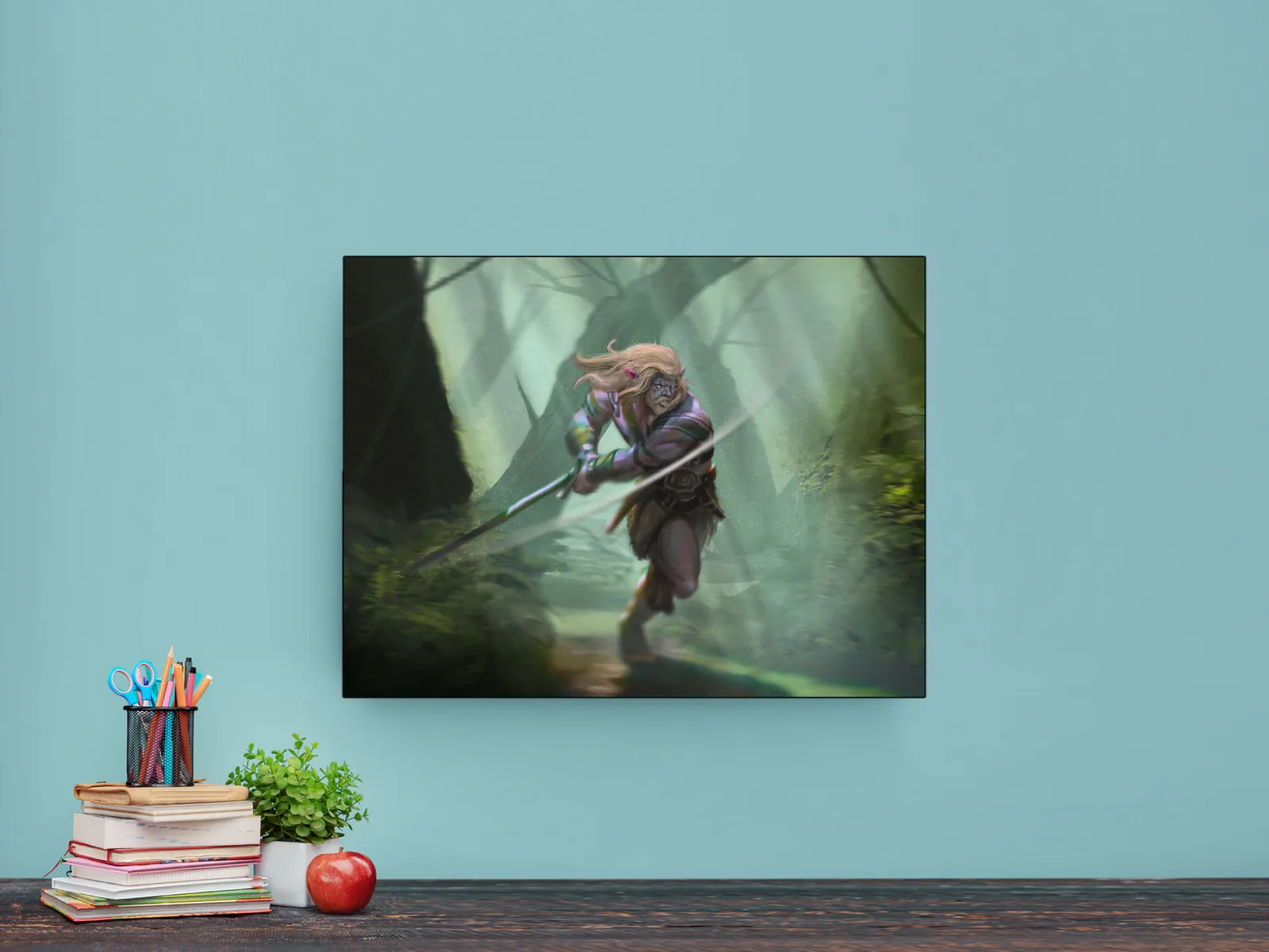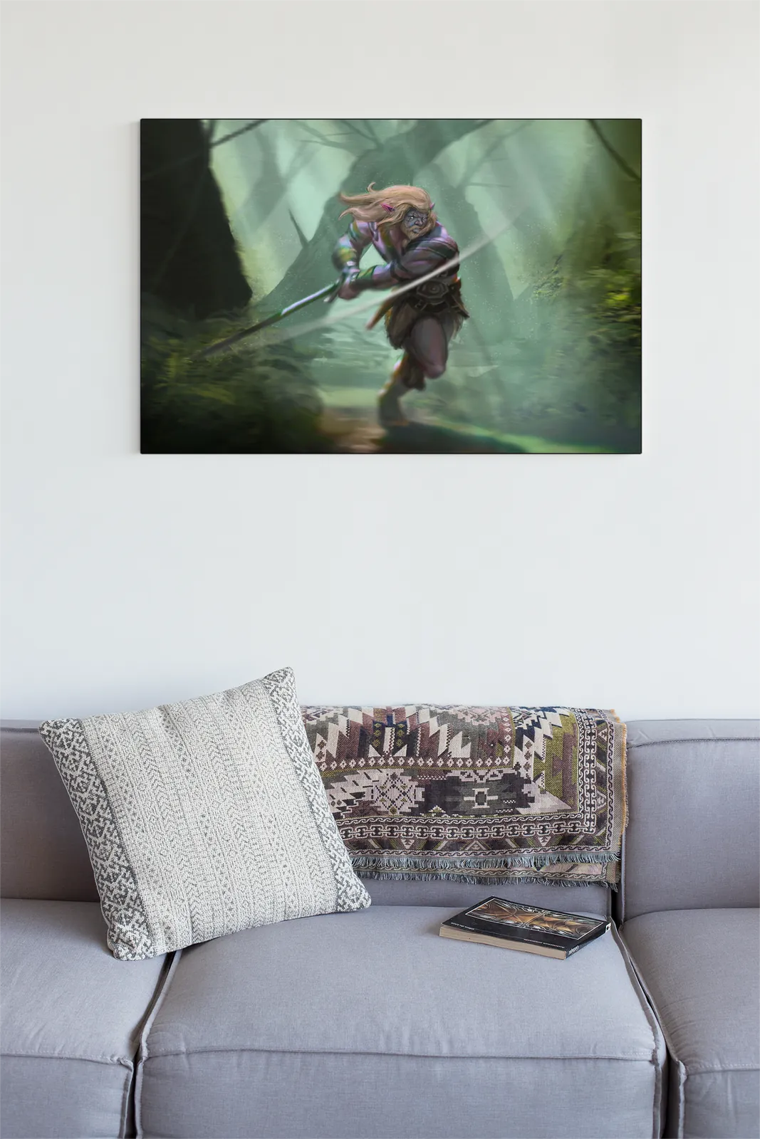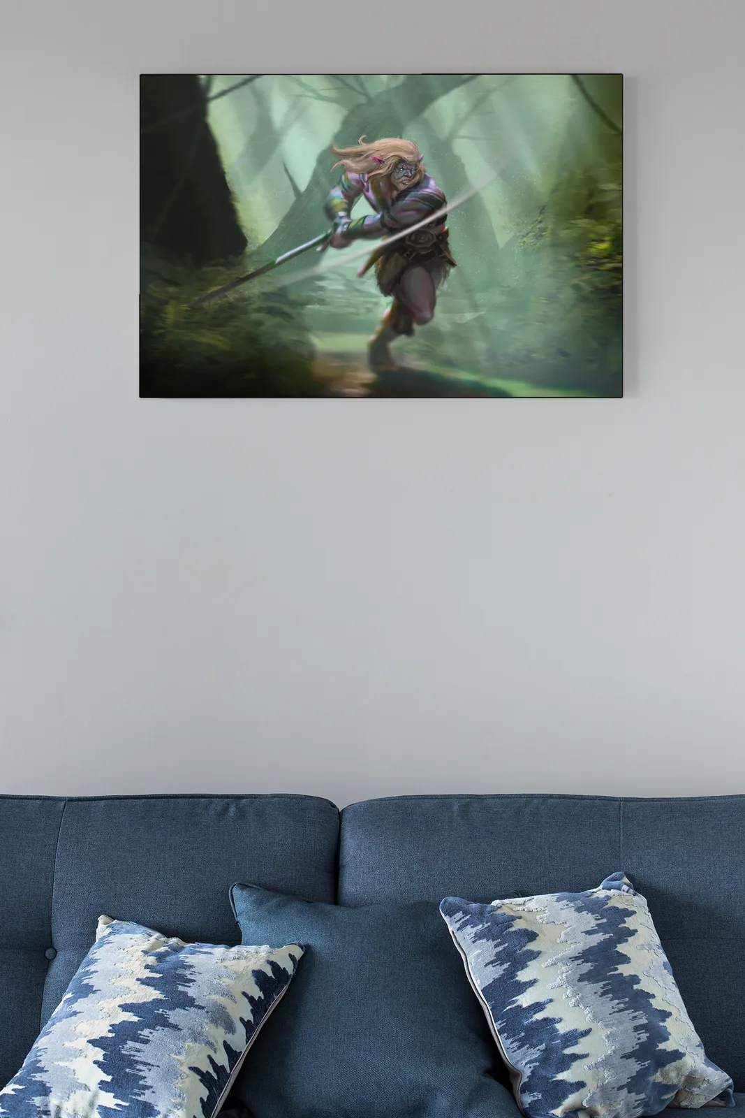 In a breath of green fog, Fire Crest Elf Warrior surges through ancient trees with a blade already in motion. Moreover, Fire Crest Elf Warrior gallery canvas print delivers that split-second of pursuit and impact. As a result, the scene feels fast, sharp, and alive.