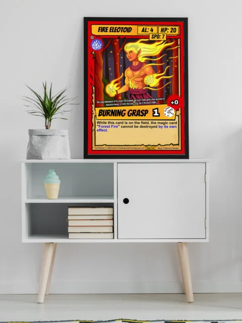 The parchment-textured ability panel shows BURNING GRASP with full effect text below the central illustration. Collectors recognize the cel-shaded style and warm palette from across the room. This fire eleotoid trading card canvas print brings Fabricio Vainer’s card 002/150 artwork to wall scale.