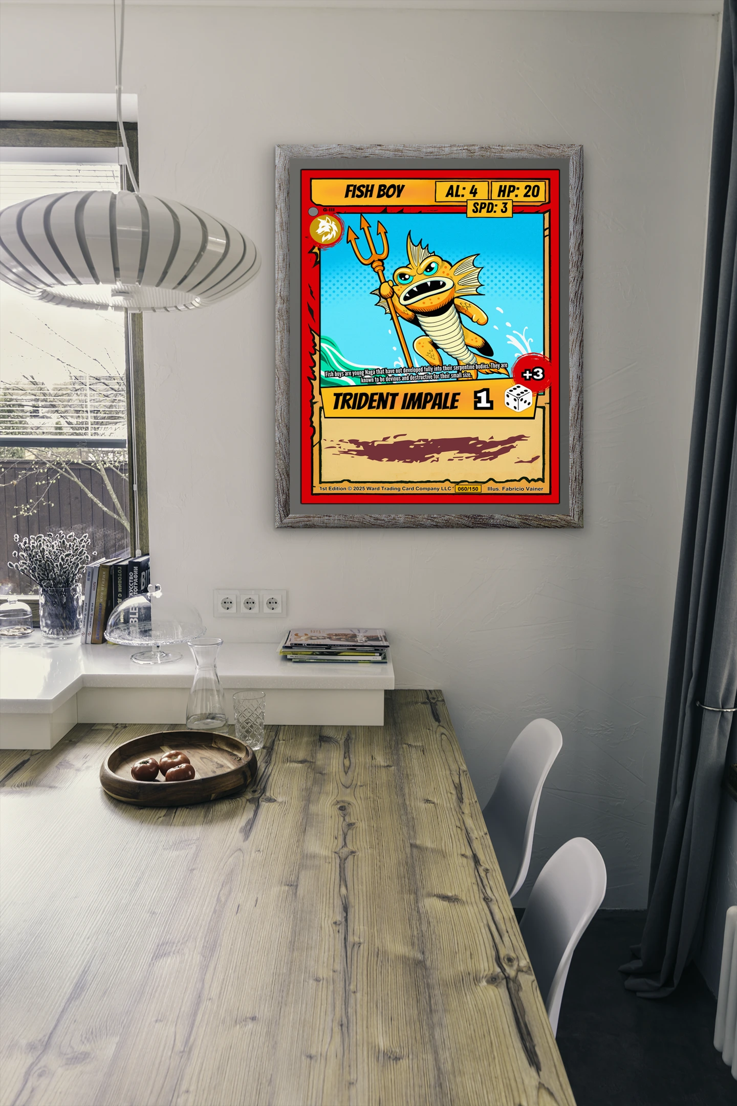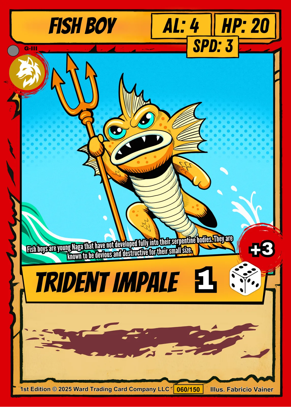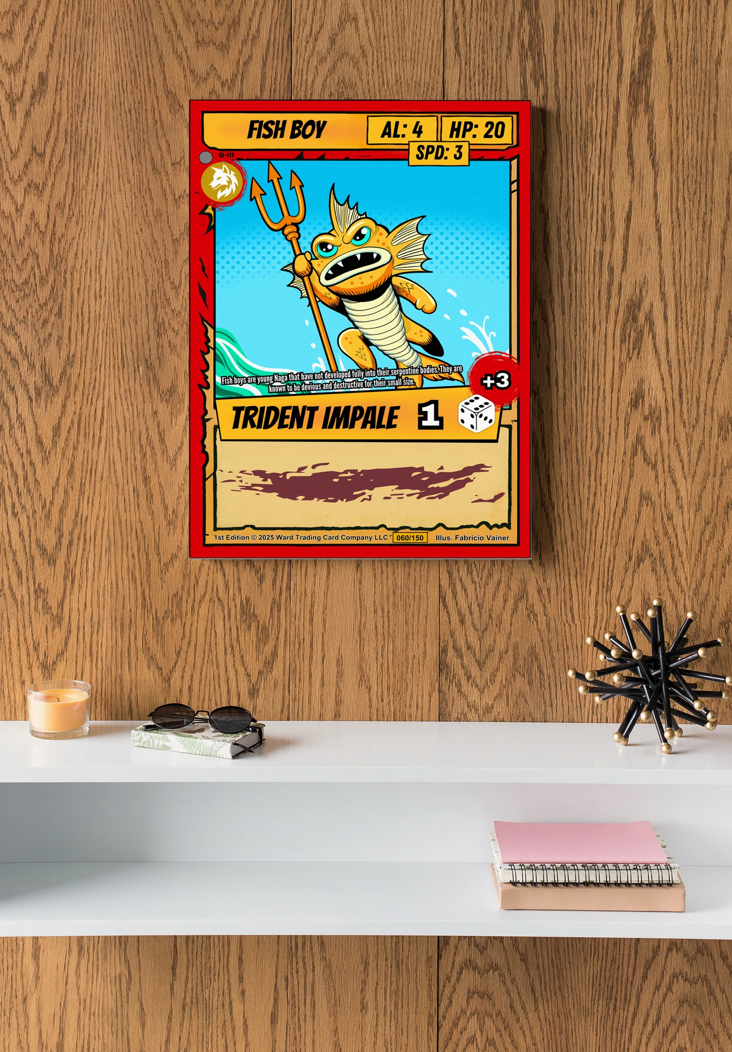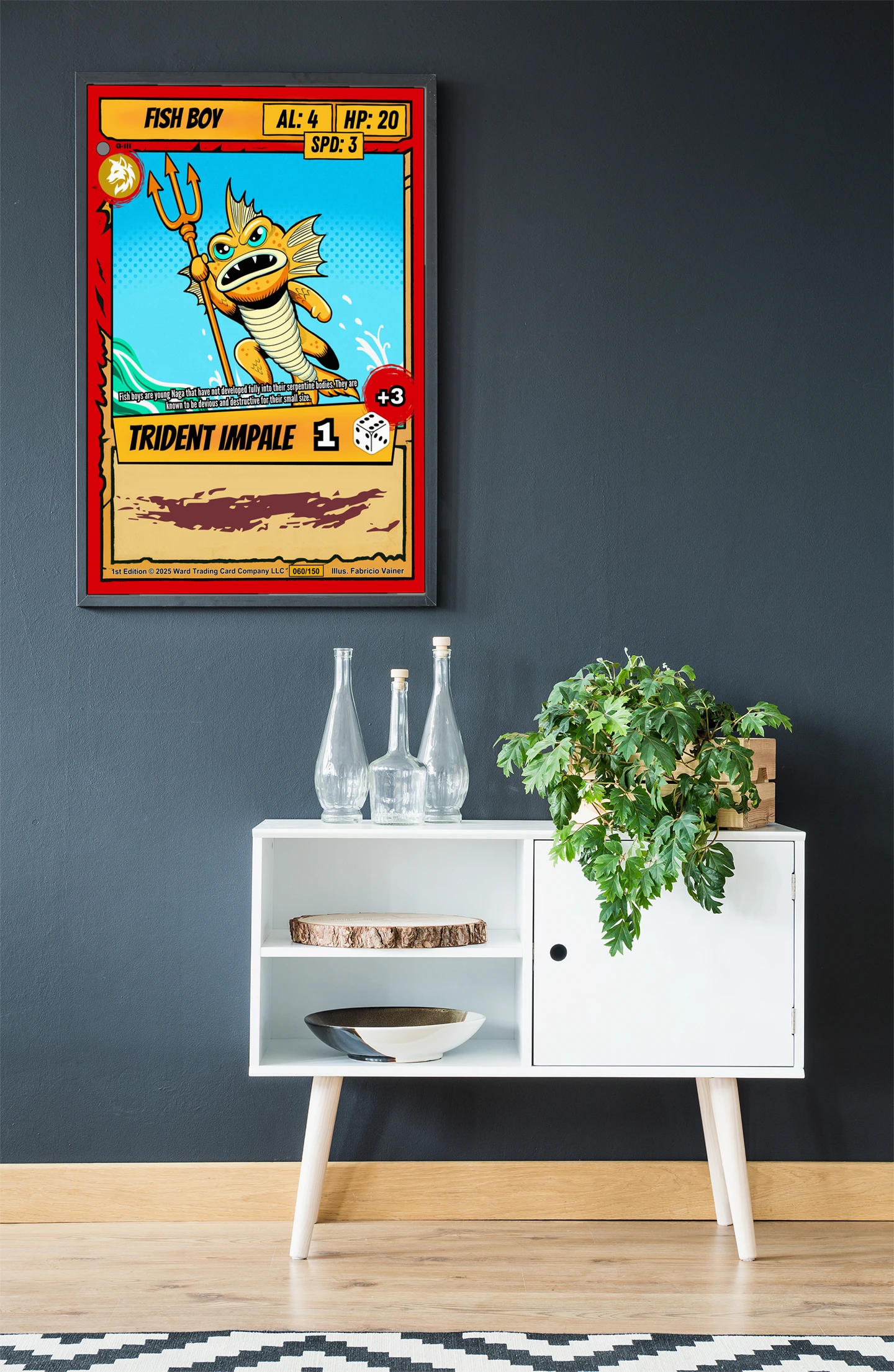 The bold outlines and comic-book shading read clearly from across a room. Ward TCG collectors recognize the Naga lore and card number 060/150. This fish boy trading card canvas print fits collections focused on creature cards and illustrated fantasy art.