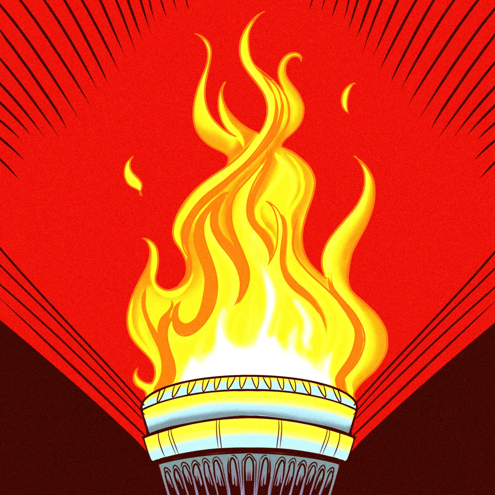 Additionally, the bold red background radiates black speed lines from the corners, creating kinetic energy. The flat color fills and clean linework evoke Soviet propaganda poster aesthetics. The high-contrast palette, moreover, combines revolutionary intensity with vintage graphic design sensibility.