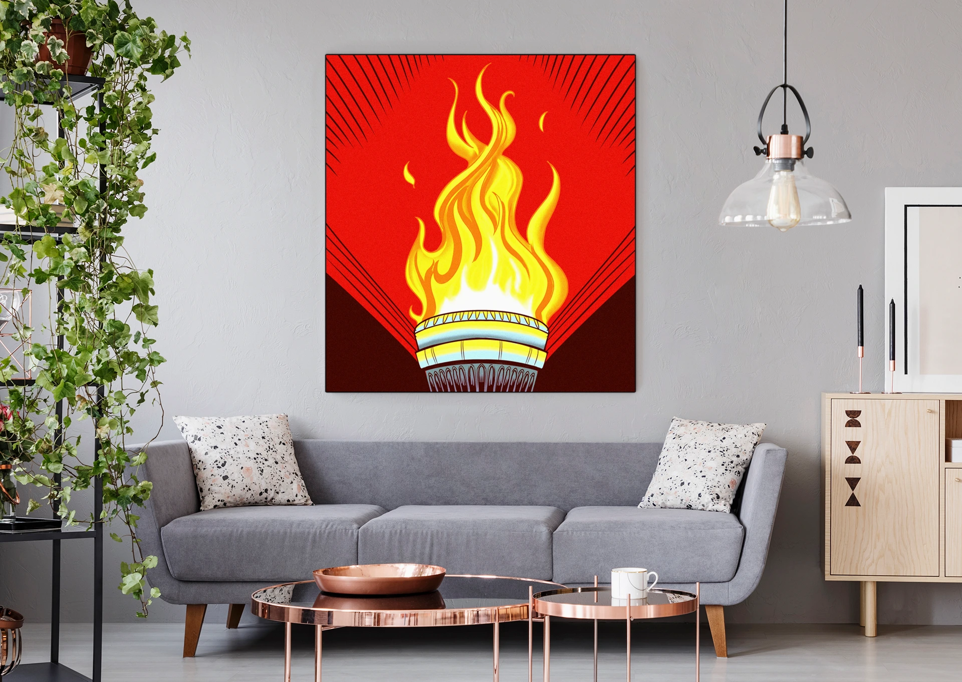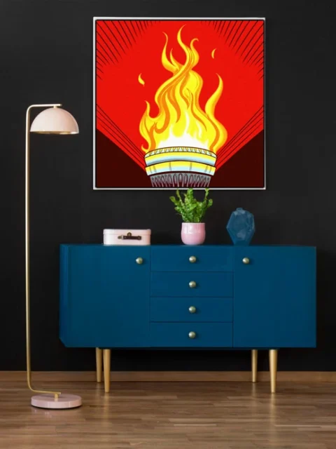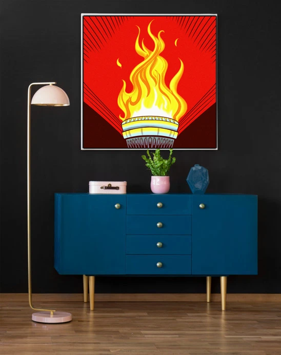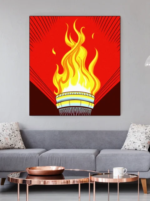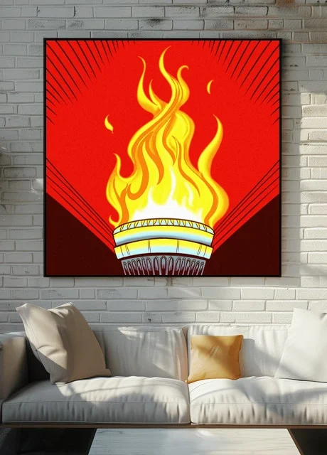 Game rooms and creative studios benefit from the revolutionary aesthetic and bold color blocking. Additionally, the torch motif works particularly well in spaces celebrating vintage graphic design.