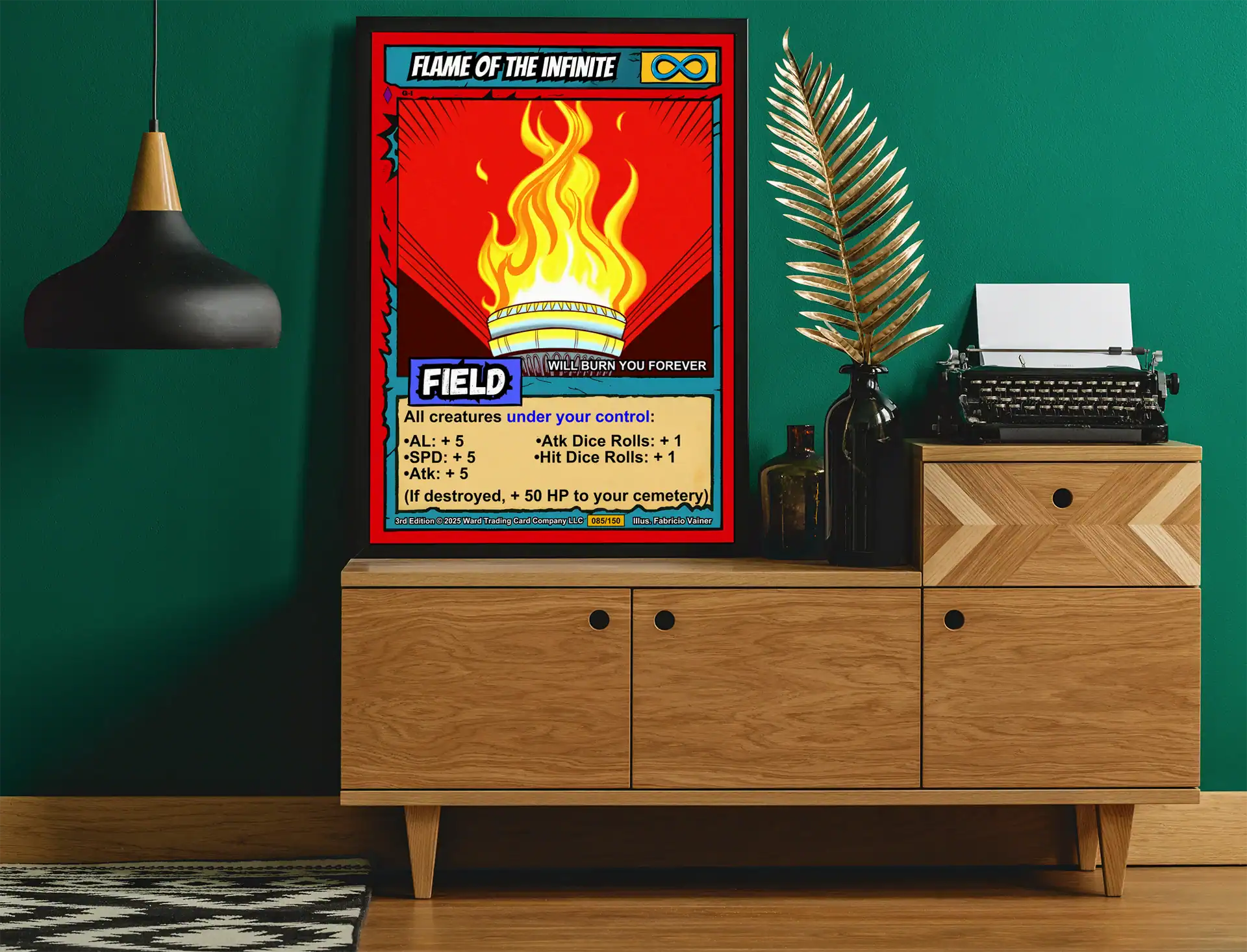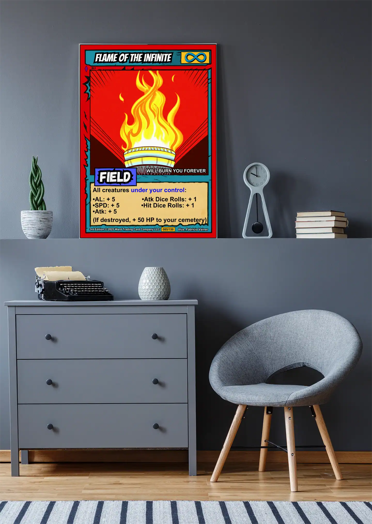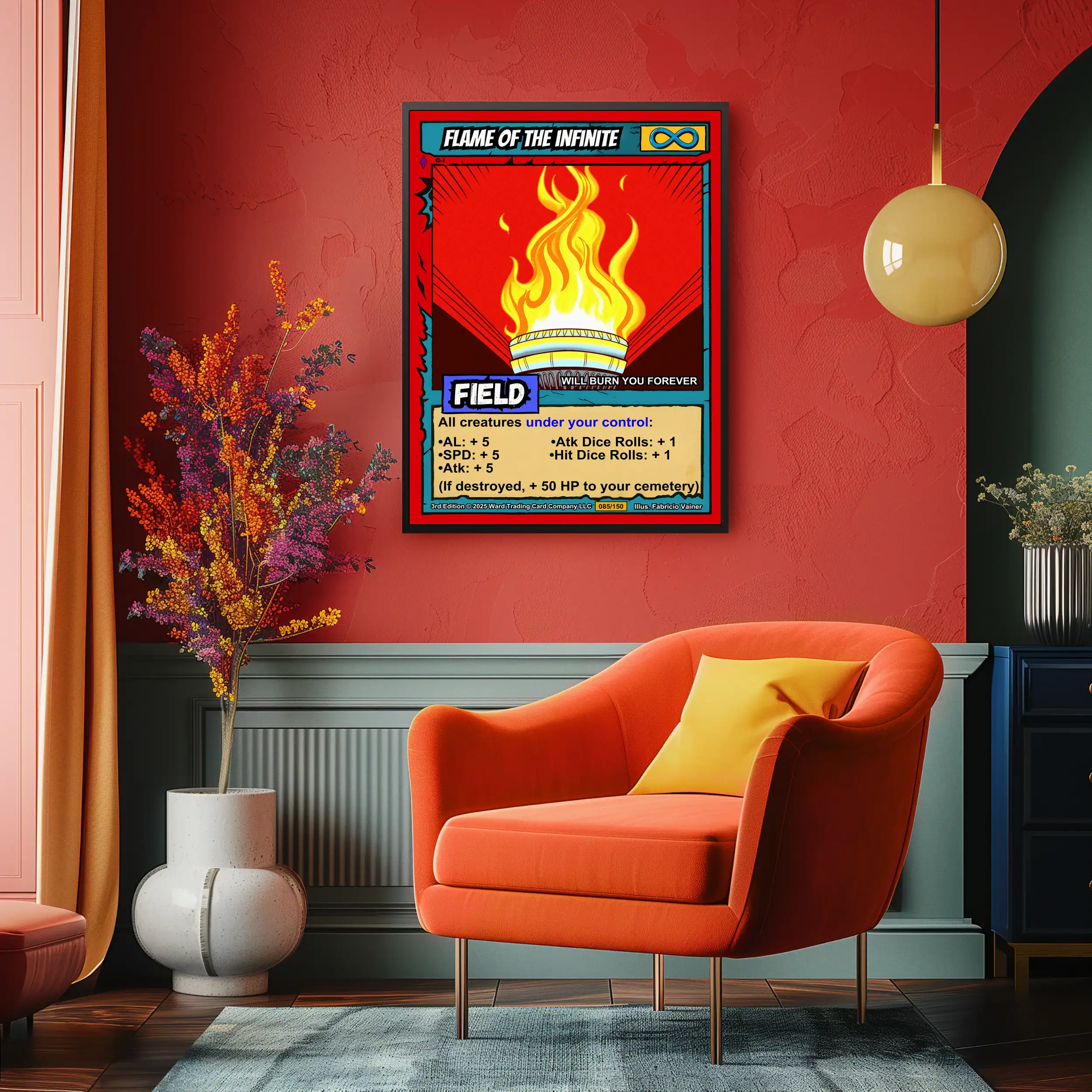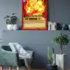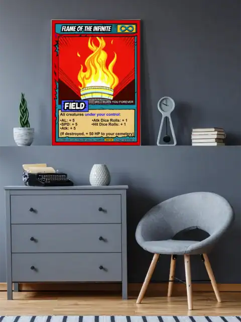 This piece commands attention with eternal flame symbolism that burns bright. TCG collectors and fantasy enthusiasts recognize authentic retro comic book craftsmanship instantly. Particularly, this flame of the infinite trading card canvas print anchors any serious collection.