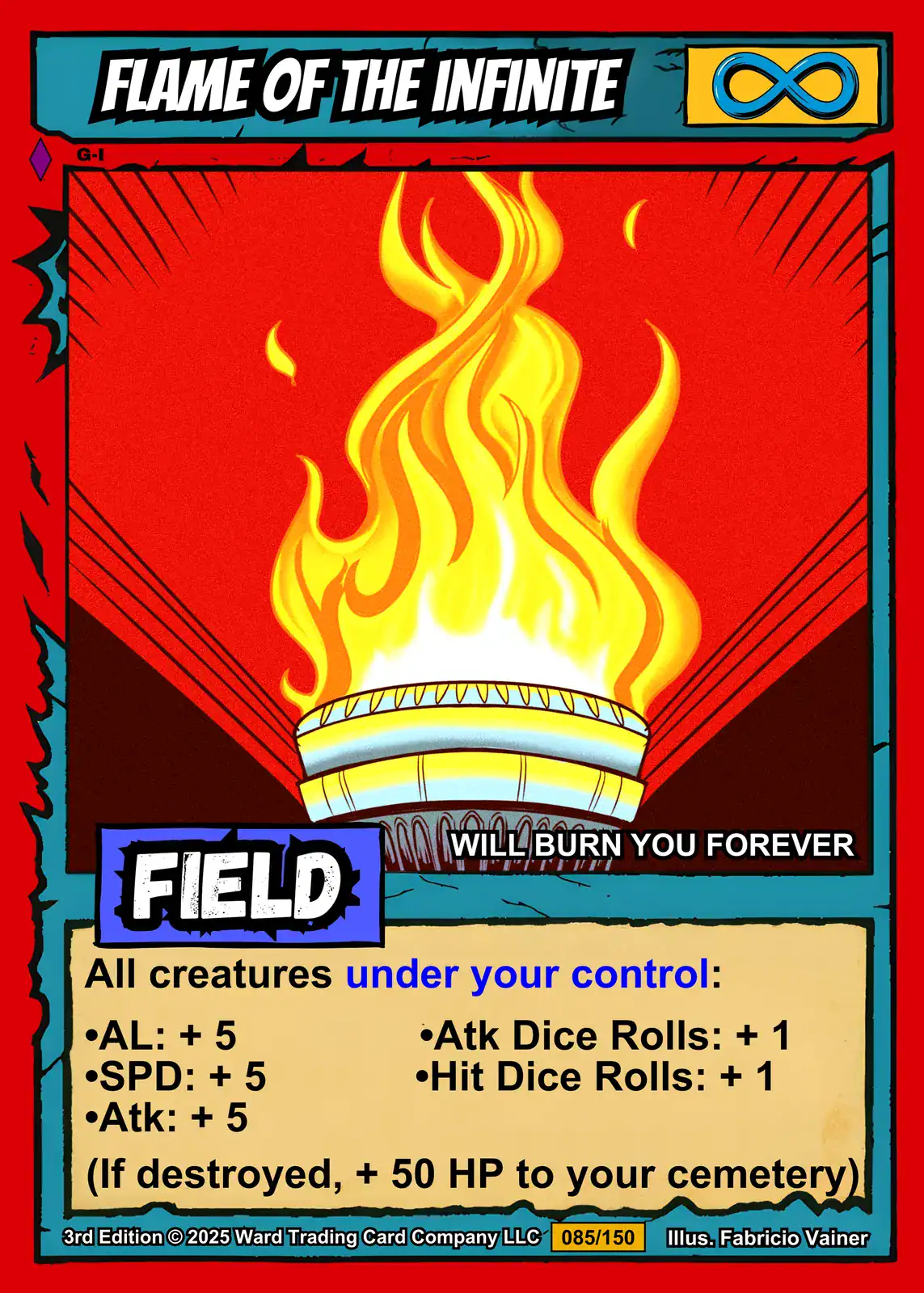 Indeed, the warm yellow and orange flames flow upward with comic book intensity. The deep red background creates dramatic contrast behind the ornate metal vessel. Moreover, the infinity symbol and field designation complete Ward TCG’s signature card layout.