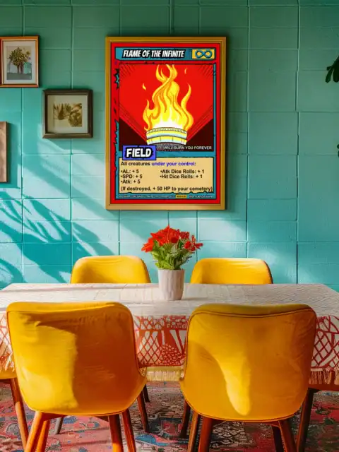 Creative studios and gaming dens gain mystical atmosphere from this eternal flame artwork. Additionally, the bold colors and symbolic power inspire magical worldbuilding sessions.