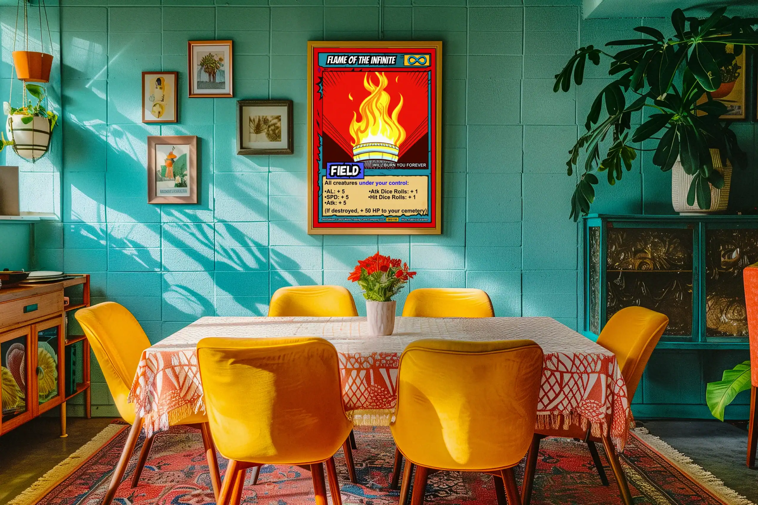 A golden brazier radiates brilliant yellow flames against deep crimson darkness. This flame of the infinite trading card canvas print showcases Fabricio Vainer’s bold cel-shaded artistry. Notably, the turquoise border frames the mystical fire with distressed vintage edges.
