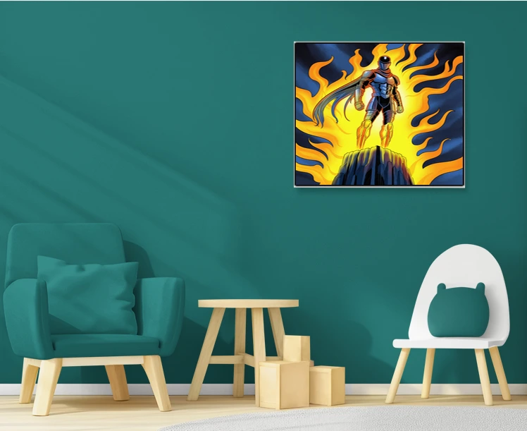 The heroic composition works in game rooms where vertical wall space benefits from upward movement. Additionally, the bold flames and armored figure appeal to collectors displaying Ward TCG artwork.