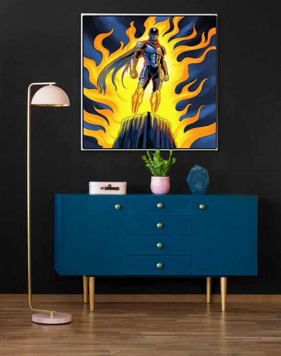 A jet-propelled warrior ascends from a rocky spire on twin flame trails. This flame sentinel art trading card art canvas print captures Fabricio Vainer’s bold comic illustration style. The figure’s single glowing eye notably anchors the composition’s vertical thrust.