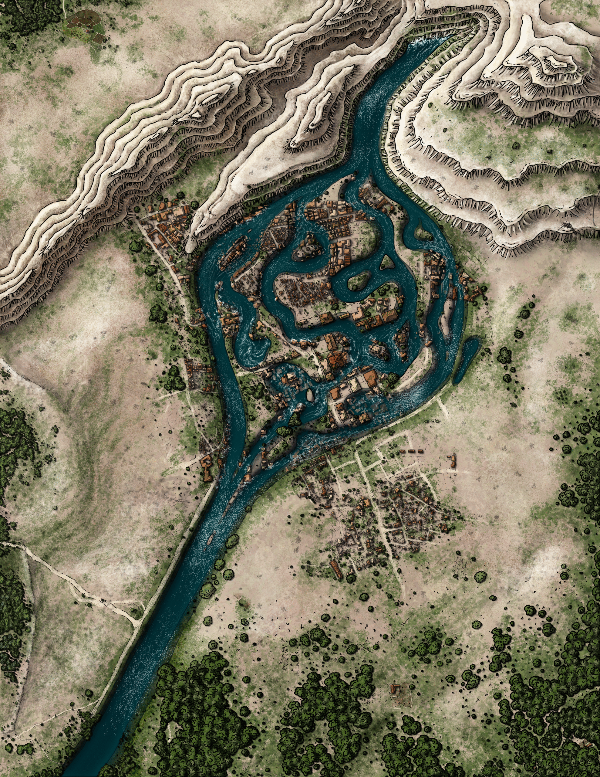 Flooded Town Fantasy Map featuring rivers, cliffs, canals, and sprawling settlements