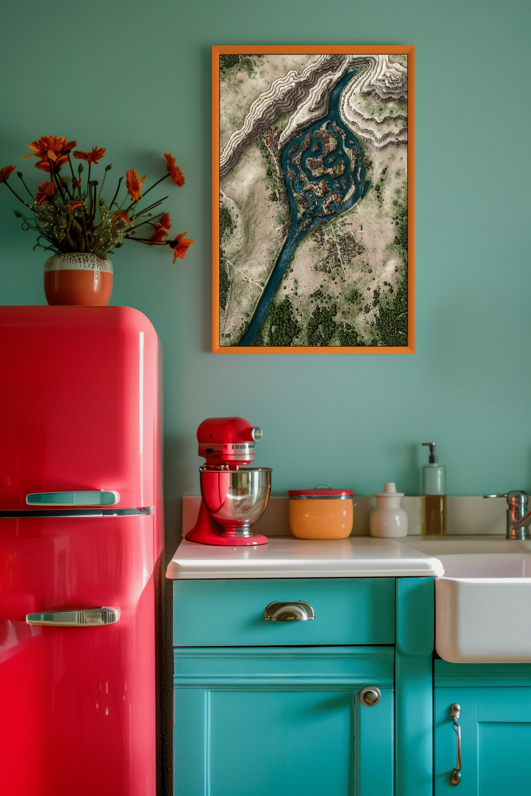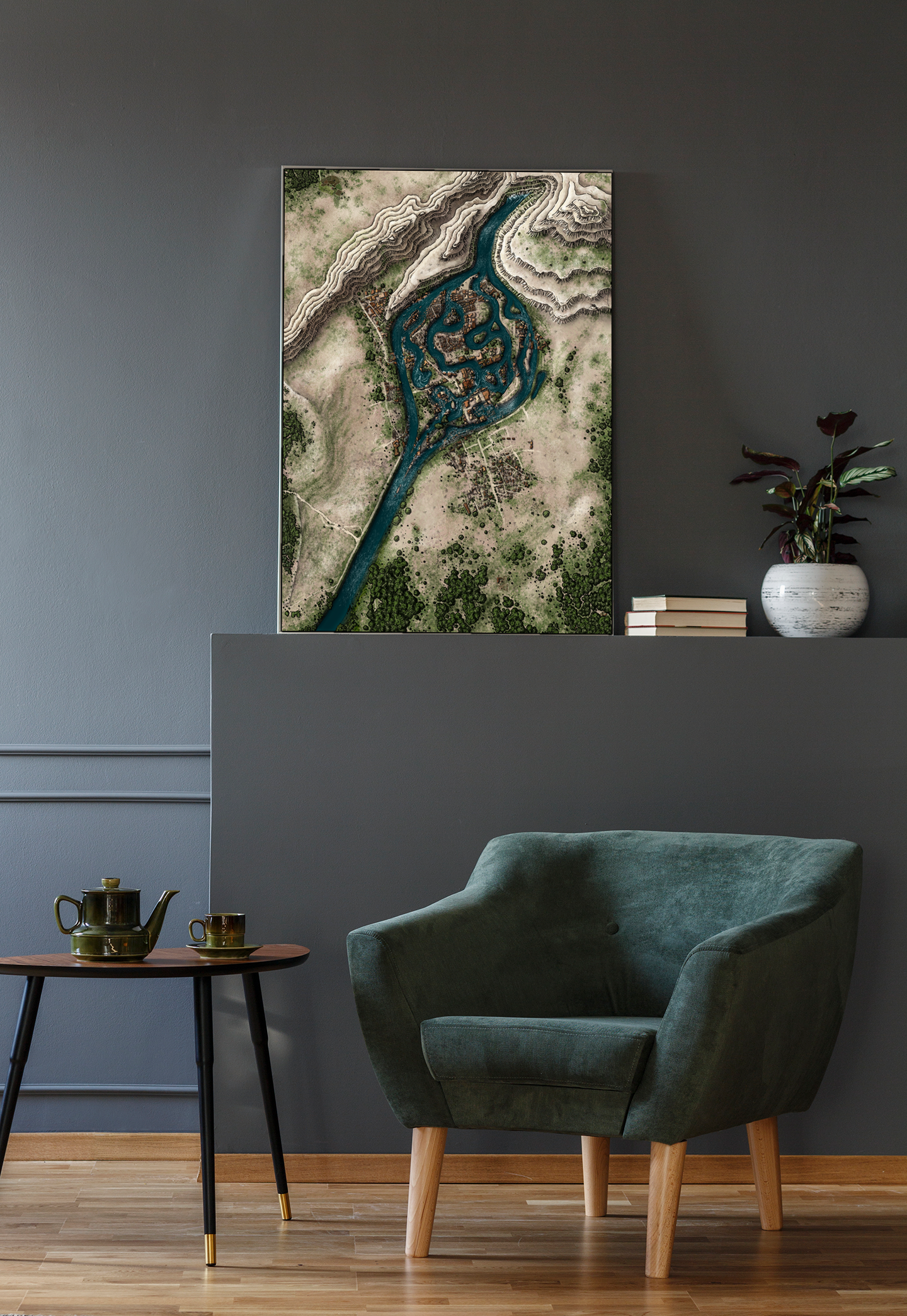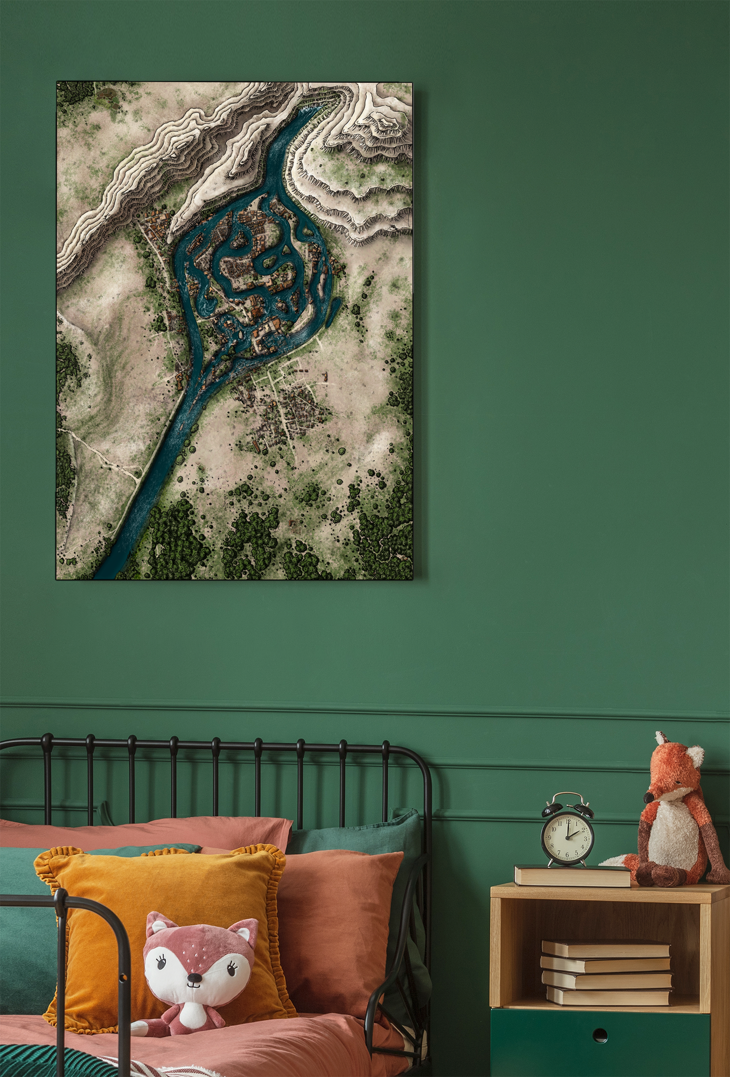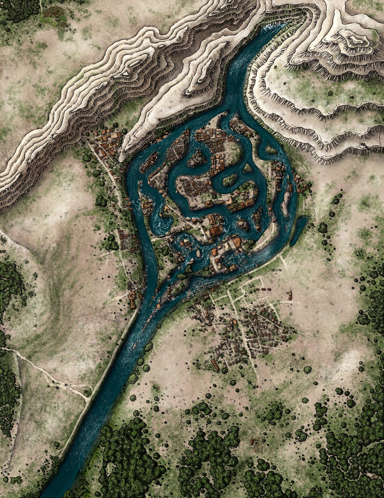 Flooded Town Fantasy Map Canvas Print — a settlement of rivers, canals, and perilous waterways by Alyssa Faden. Archival wall art for Dungeon Masters and collectors.