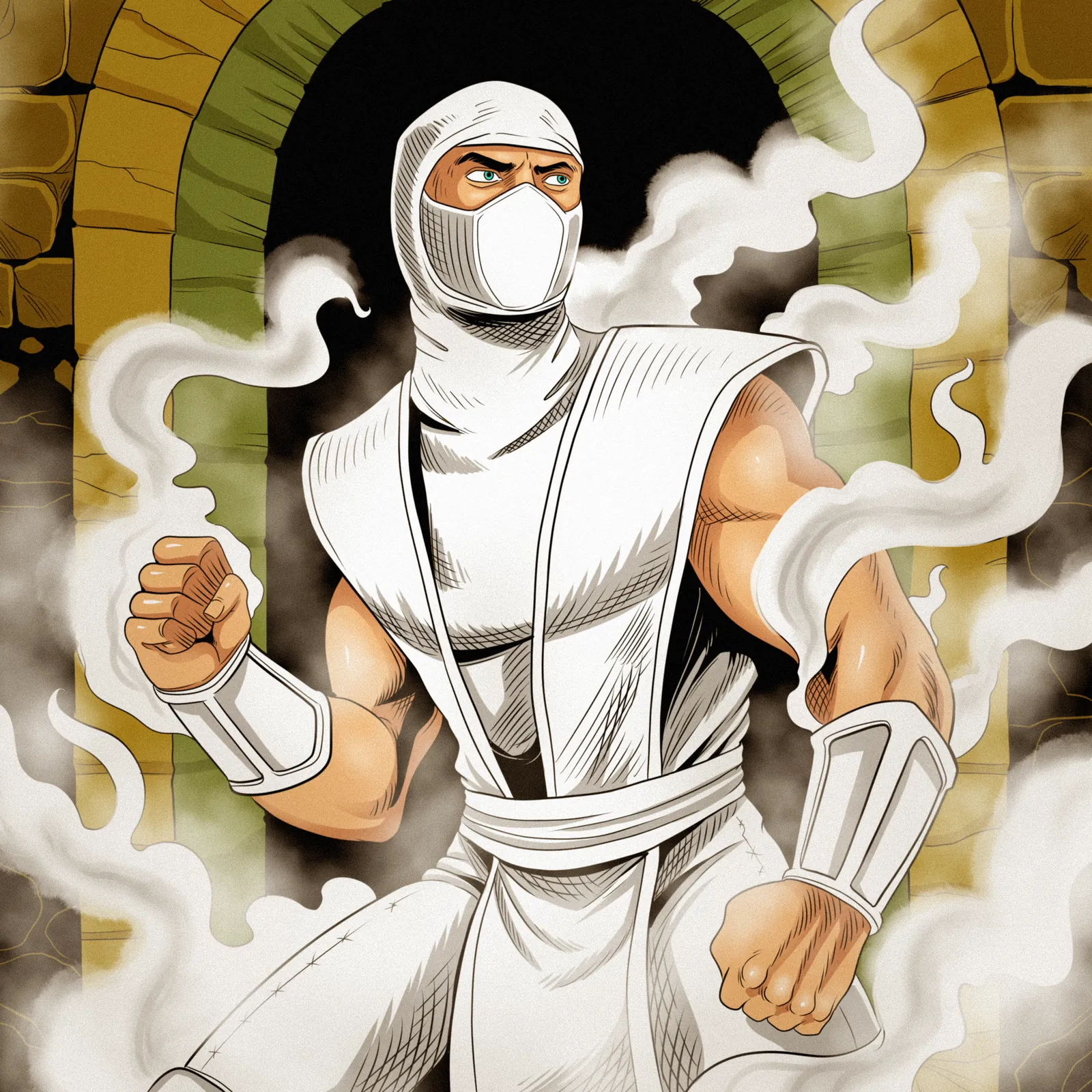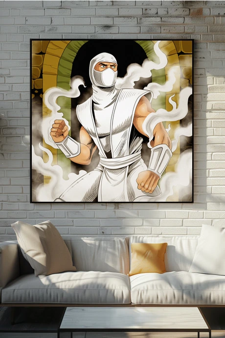 A white-clad ninja warrior stands ready with clenched fists and piercing eyes. This fog art trading card art canvas print captures Fabricio Vainer’s bold comic illustration style. The muscular figure emerges from swirling mist, notably framed by a golden stone archway.
