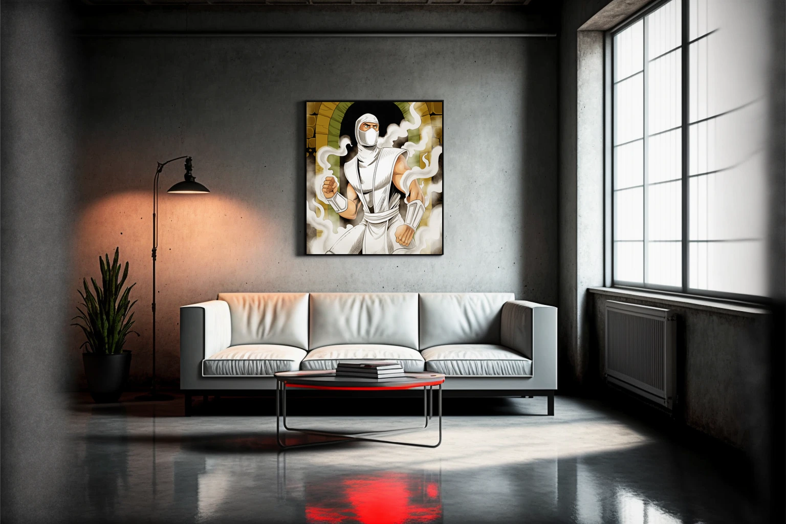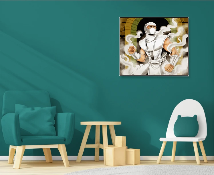 Display this in a game room alongside other TCG illustration or martial arts themed collections. Additionally, the mysterious warrior composition works particularly well in creative studio spaces seeking action-focused wall pieces.