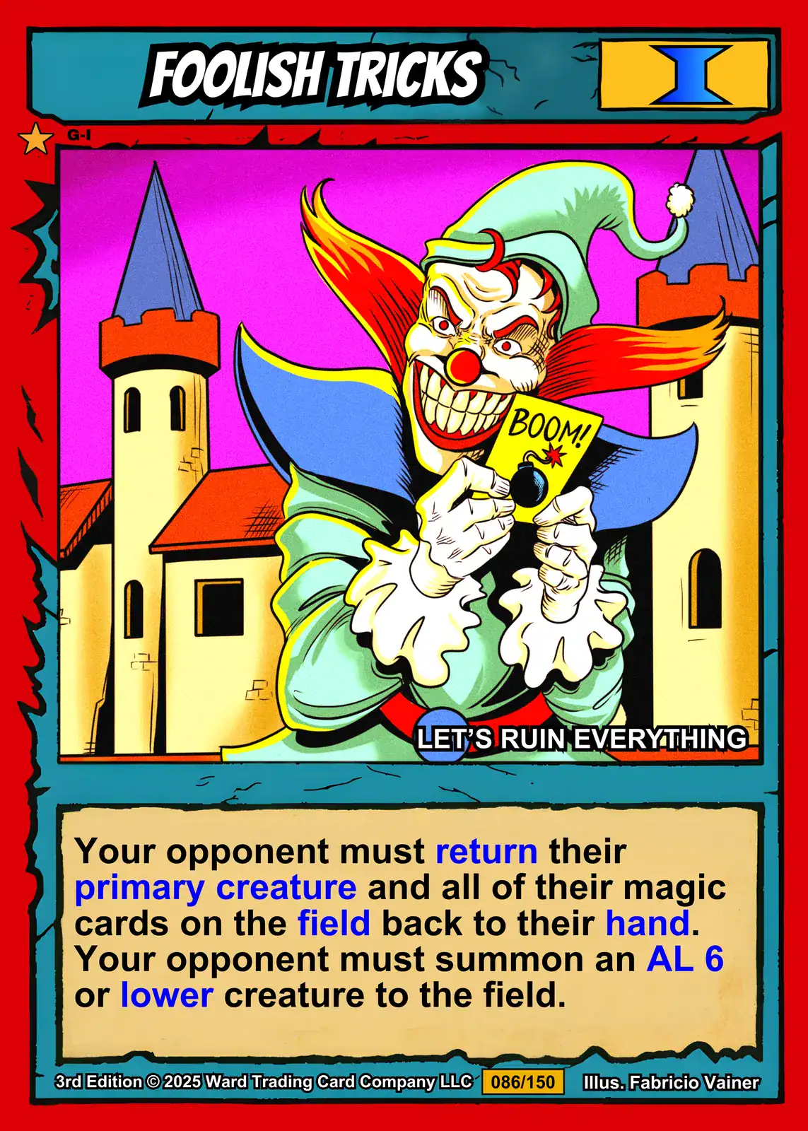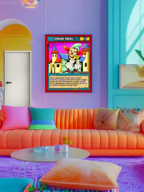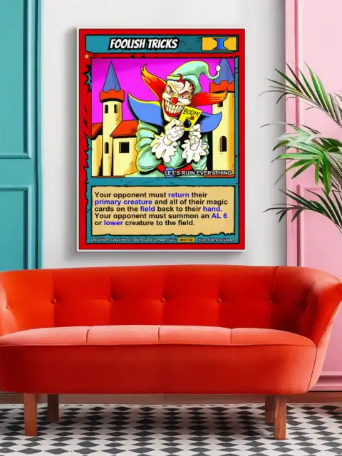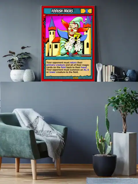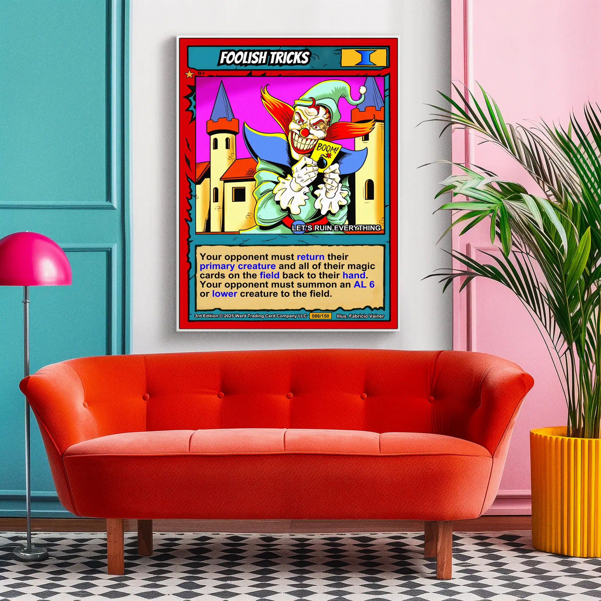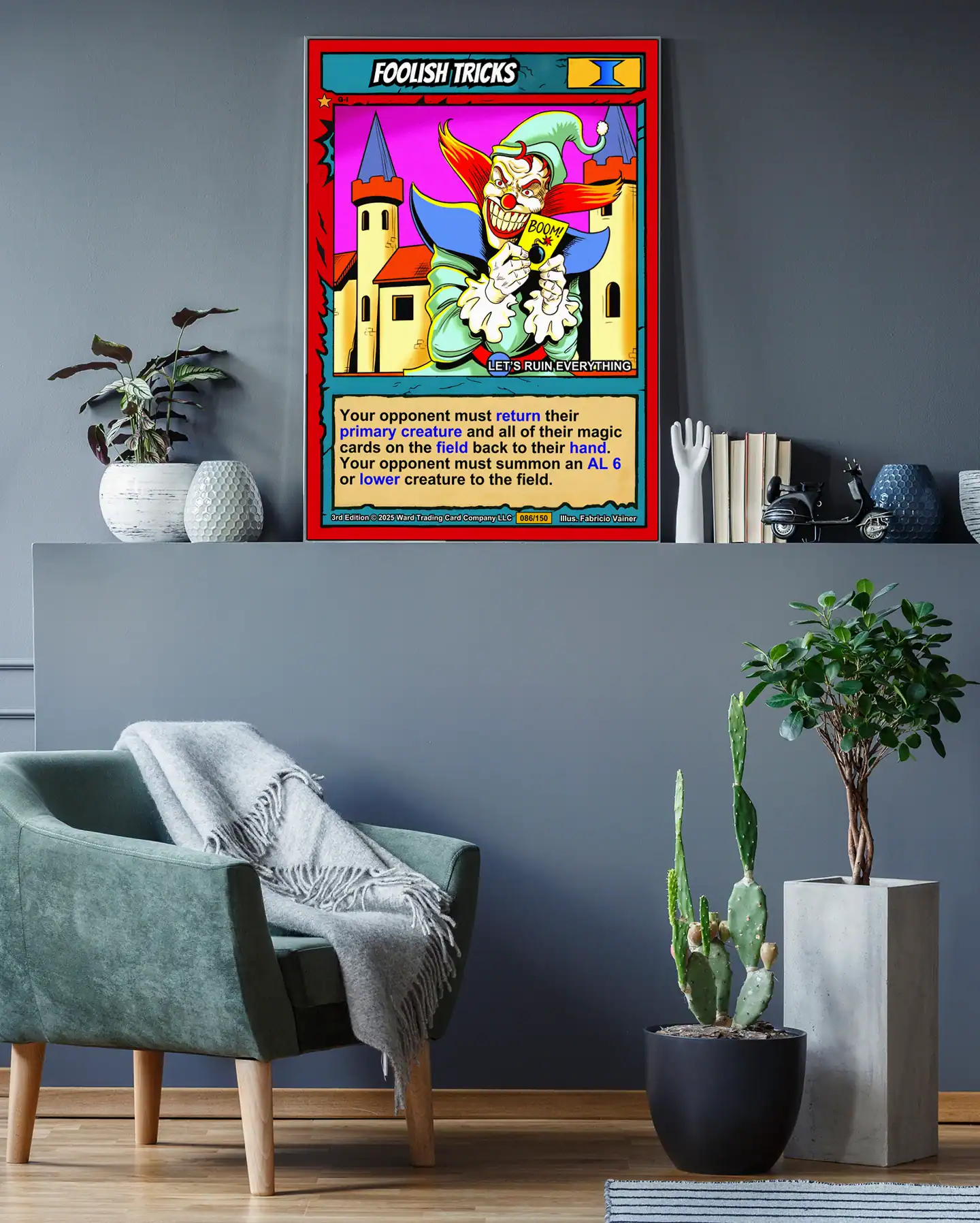 Owning this declares your appreciation for chaos-loving characters and retro TCG art. Collectors who value mischievous humor and 1990s comic styling recognize quality illustration. Particularly, this foolish tricks trading card canvas print celebrates Ward’s playful spirit.