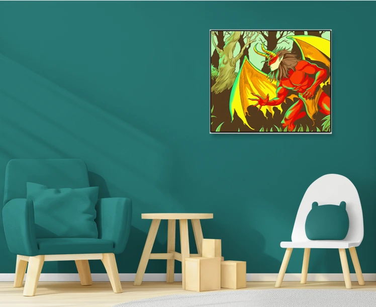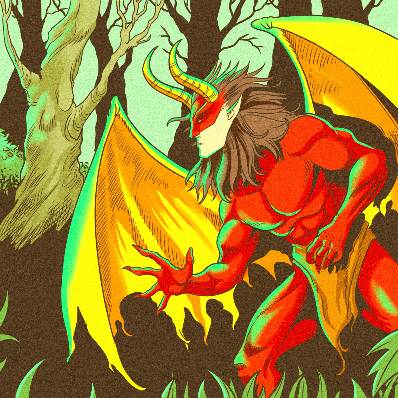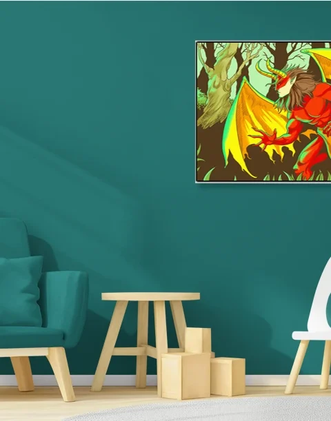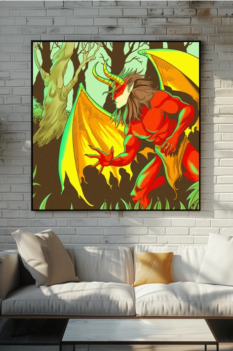 A red-skinned demon crouches in predatory readiness, wings spread wide. This forest demon art trading card art canvas print captures Fabricio Vainer’s bold comic book linework. Notably, green-teal rim lighting wraps the muscular form with chromatic aberration.