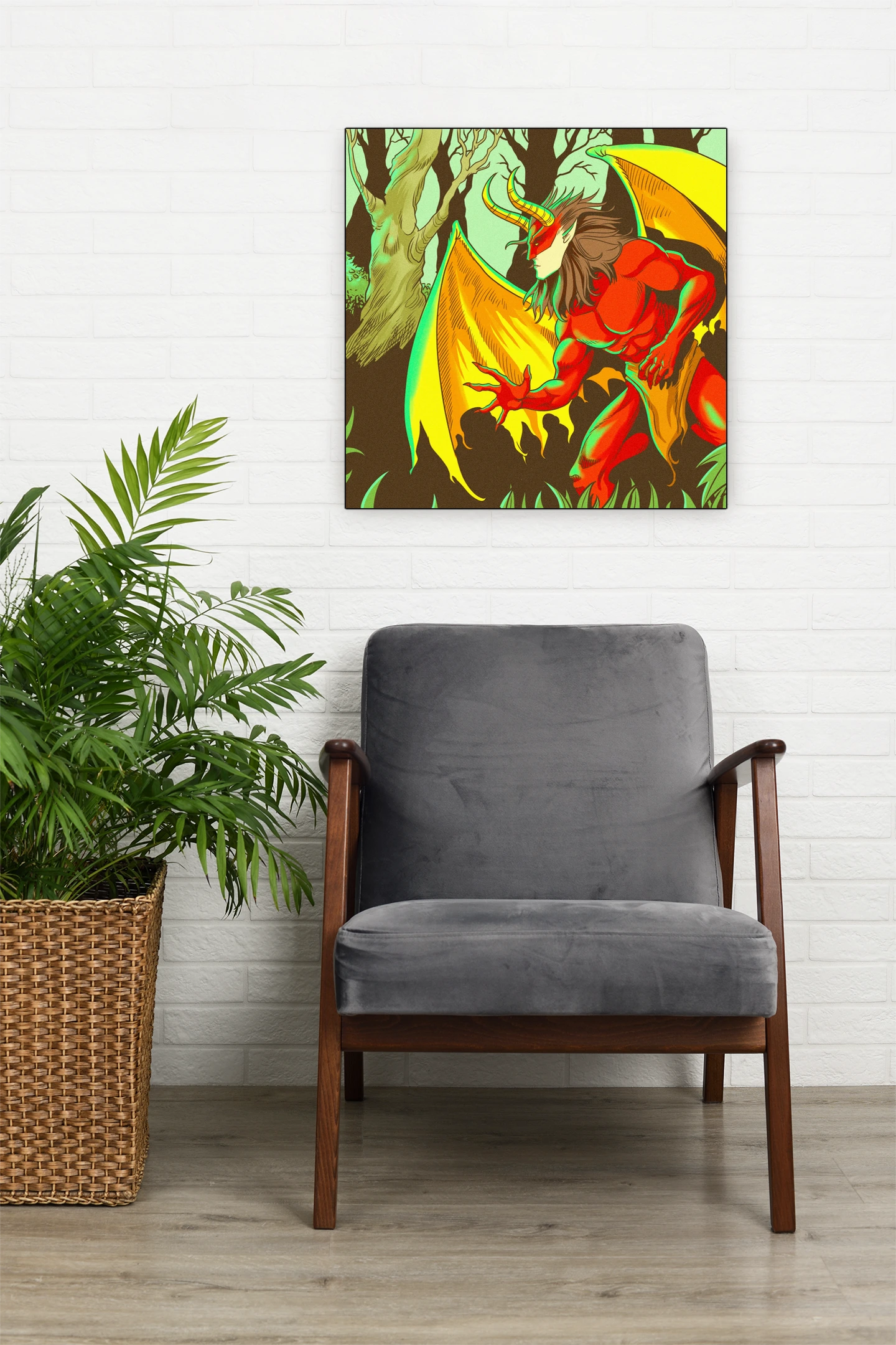On the wall, the red-orange palette holds intensity that smaller formats dilute. Ward TCG collectors and dark fantasy enthusiasts gain a gallery-ready creature illustration. This forest demon art trading card art canvas print brings menacing presence without card borders.