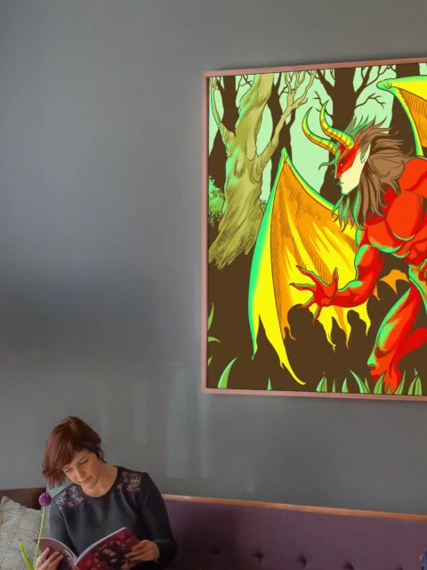Game rooms and collector walls gain a supernatural focal point that anchors darker fantasy displays. Additionally, the comic book illustration style pairs naturally with graphic novel collections.