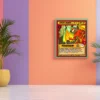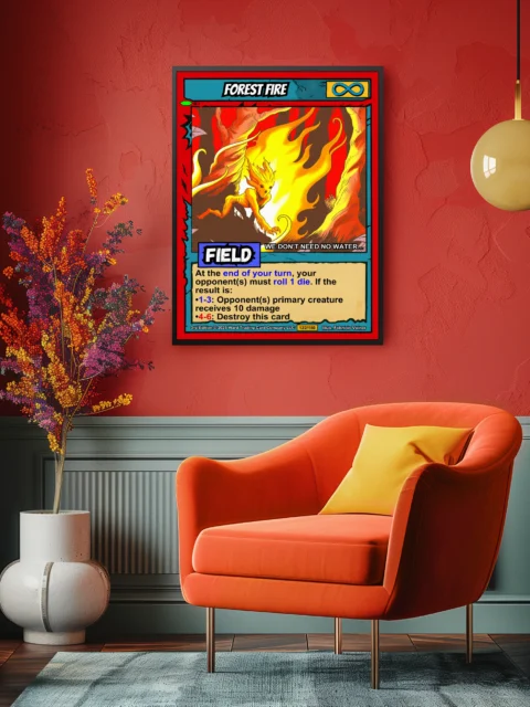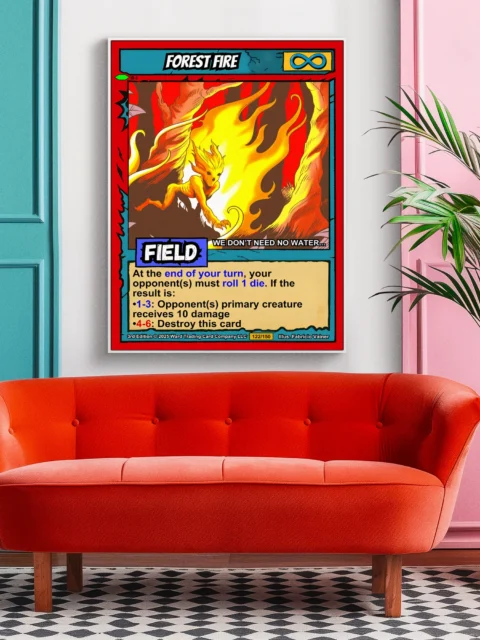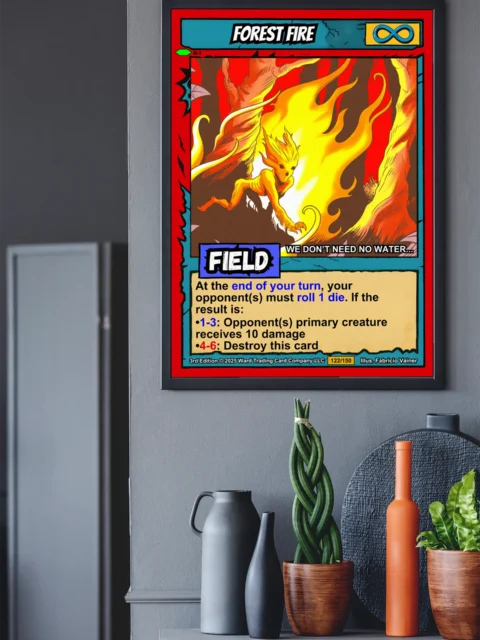 At room scale, the high-contrast flame colors and dynamic pose command attention. Collectors of Ward TCG cards and fantasy creature art appreciate the cel-shaded illustration style. This forest fire trading card canvas print captures the intensity of the original game artwork.