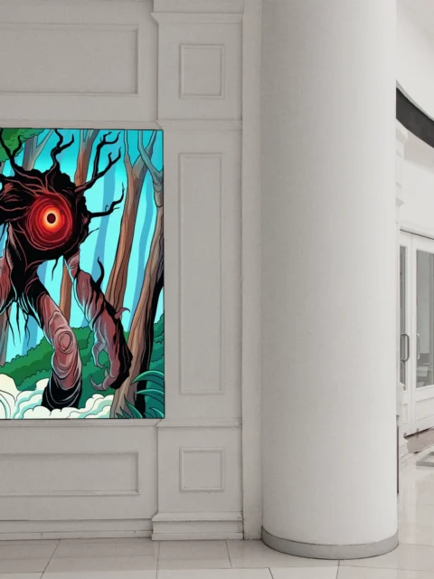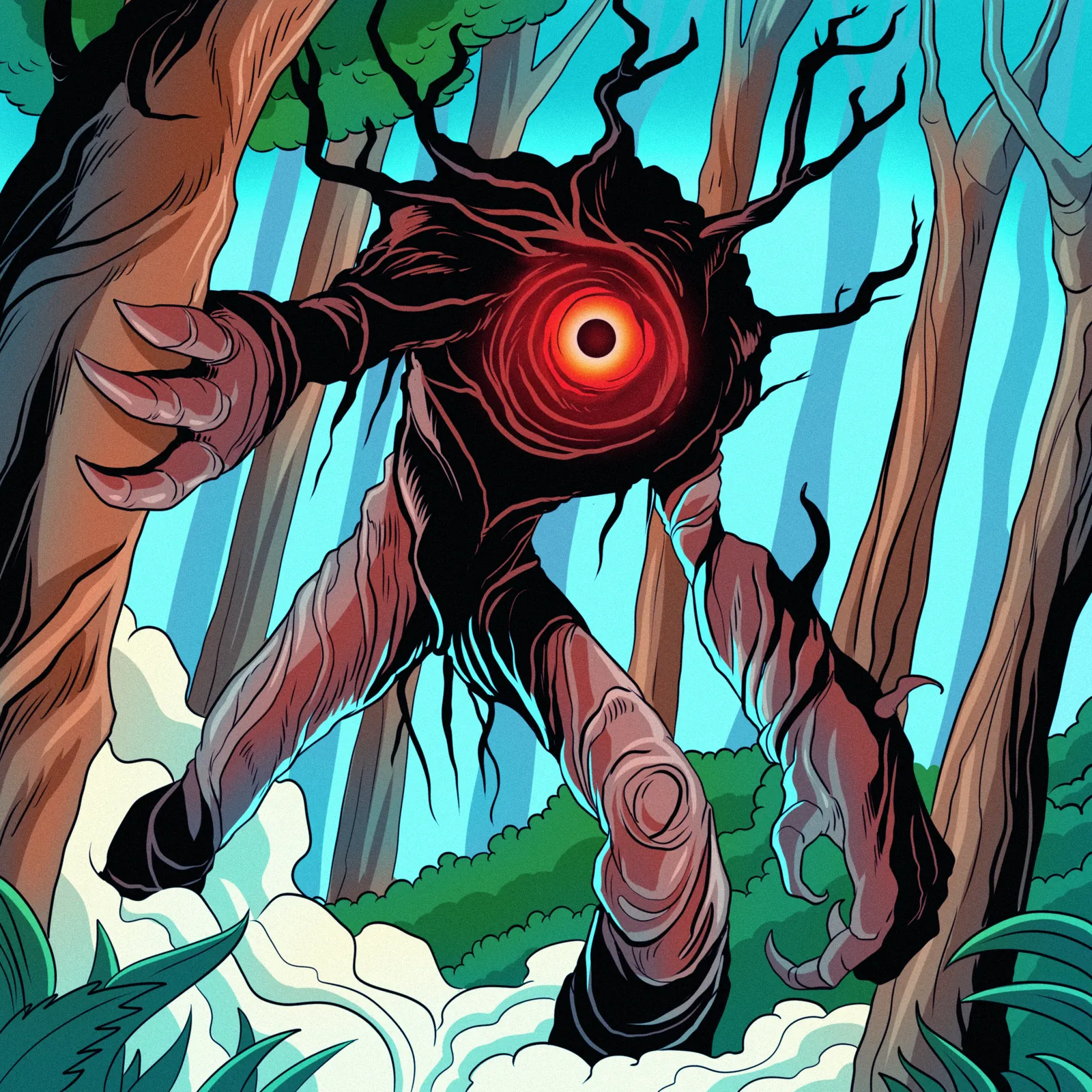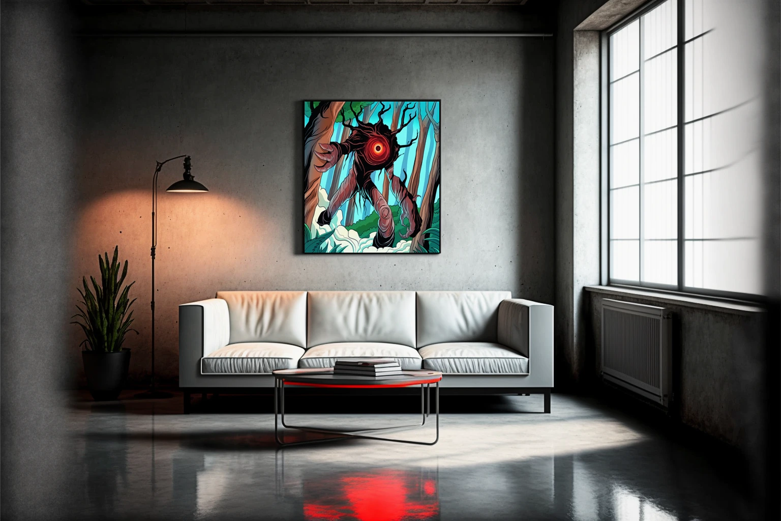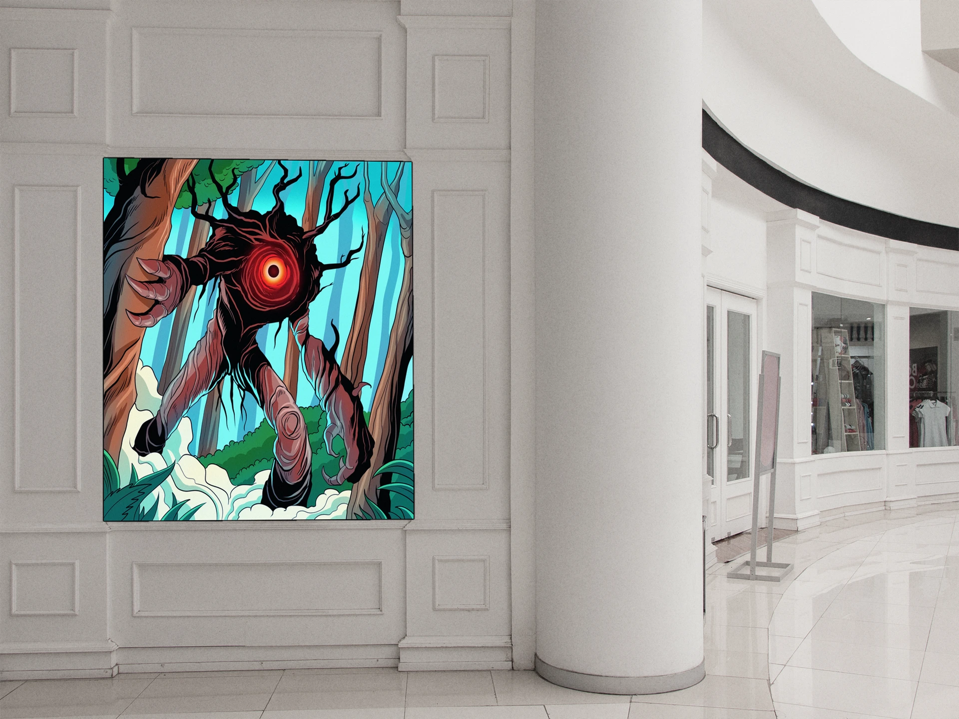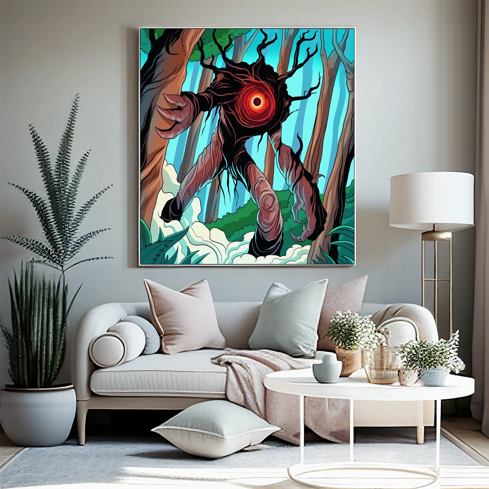 A tree-like creature with a massive glowing red eye towers over a forest. This forest guardian art trading card art canvas print captures Fabricio Vainer’s cel-shaded horror illustration. The creature’s twisted bark body extends gnarled branches outward, notably gripping surrounding tree trunks.