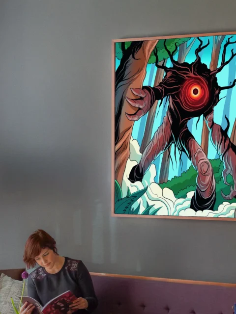 Display in a game room where horror fantasy art and creature illustrations anchor the collector aesthetic. Additionally, the vertical composition works particularly well in narrow wall spaces between shelving.