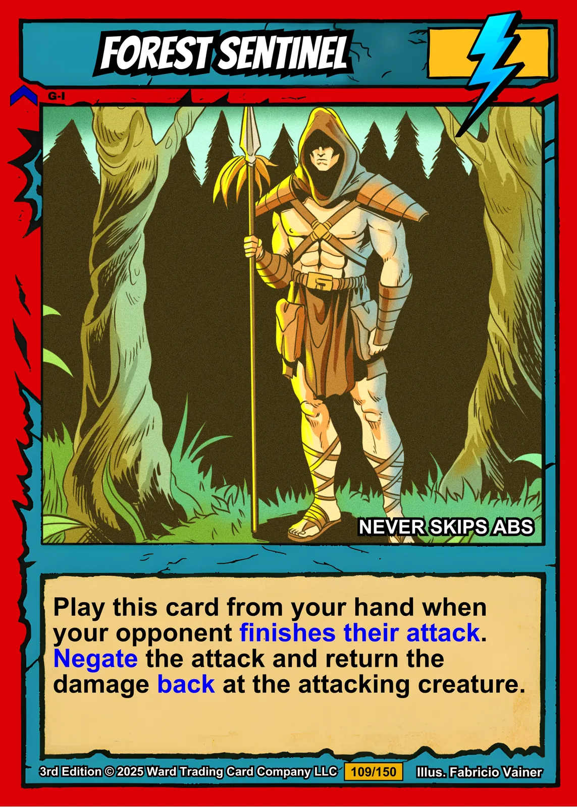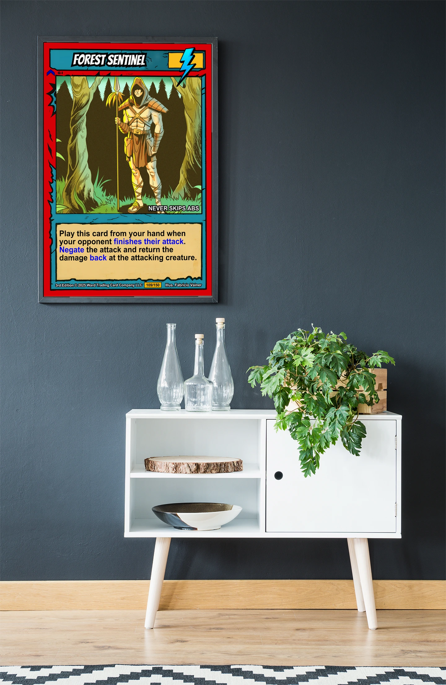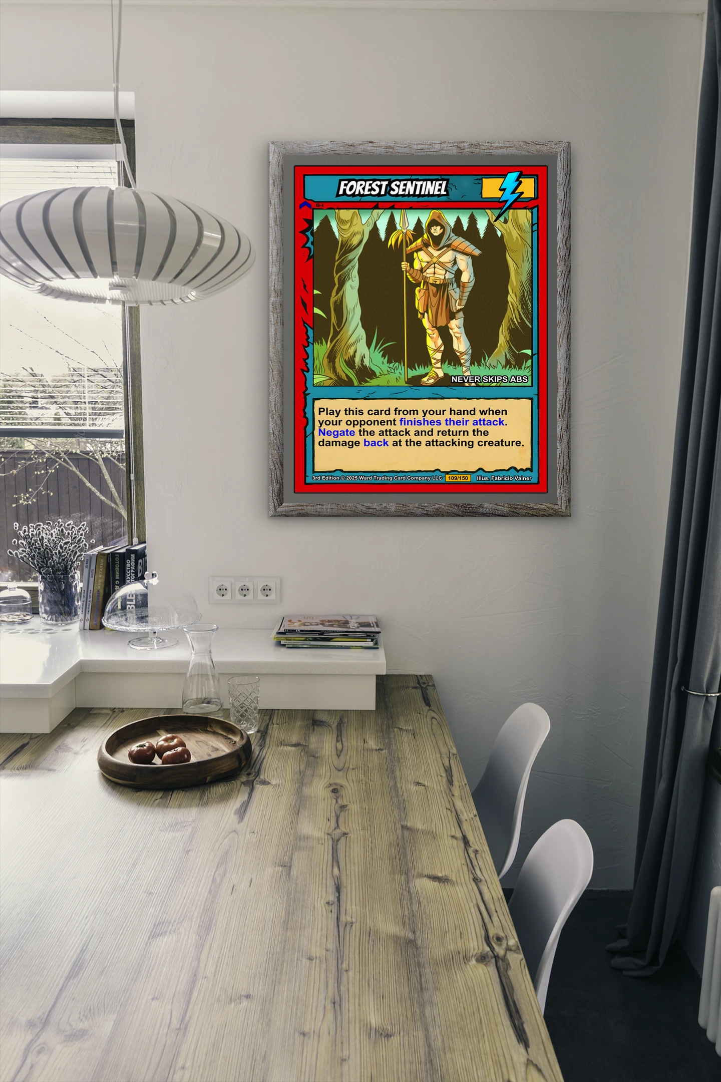 A hooded warrior grips his spear between towering forest trunks. This forest sentinel trading card canvas print showcases Fabricio Vainer’s bold comic art style. Notably, the bright red jagged border frames dark woodland atmosphere.
