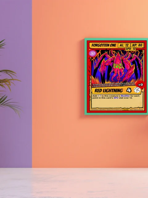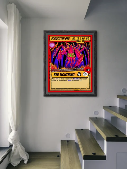 At room scale, the creature’s multiple limbs and glowing eyes create an immediate focal point. Trading card collectors recognize the full layout including card number 114/150 and Fabricio Vainer’s credit. This forgotten one trading card canvas print appeals to players who appreciate eldritch monster designs and cel-shaded illustration.