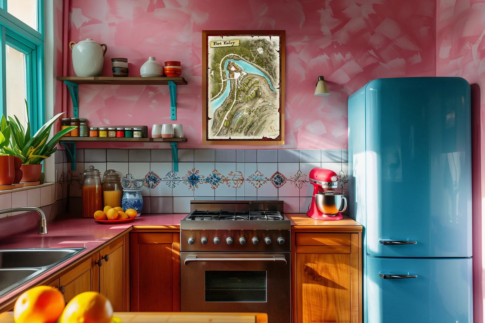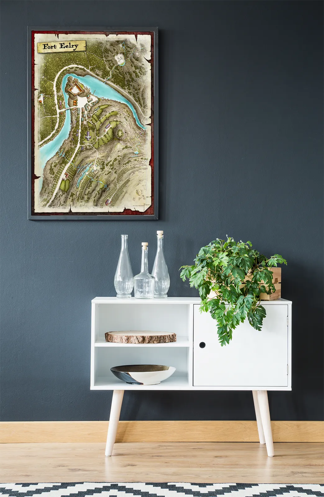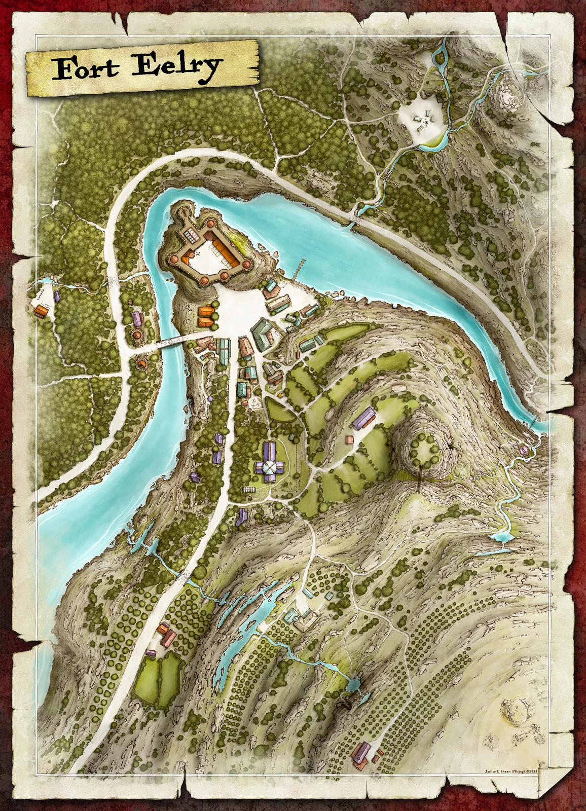 Moreover, this fantasy river stronghold map art suits collectors who appreciate grounded cartography, gamers or tabletop fans staging fortified settlements, and anyone enhancing a wall in a studio, game room, or creative space with a defensible location.