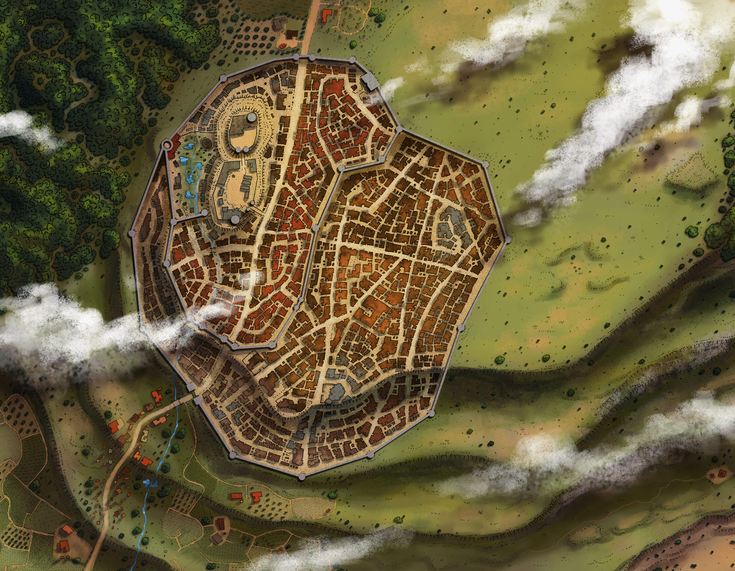 The Foxdell Fantasy Map depicts a mighty citadel-city built upon terraced hills. High walls enclose both the ancient hill fort and the sprawling city below, creating a fortress whose defenses have never been breached. Because the surrounding valleys are filled with farms and well-tended woodlands, Foxdell thrives as both a bastion of power and a center of trade.
