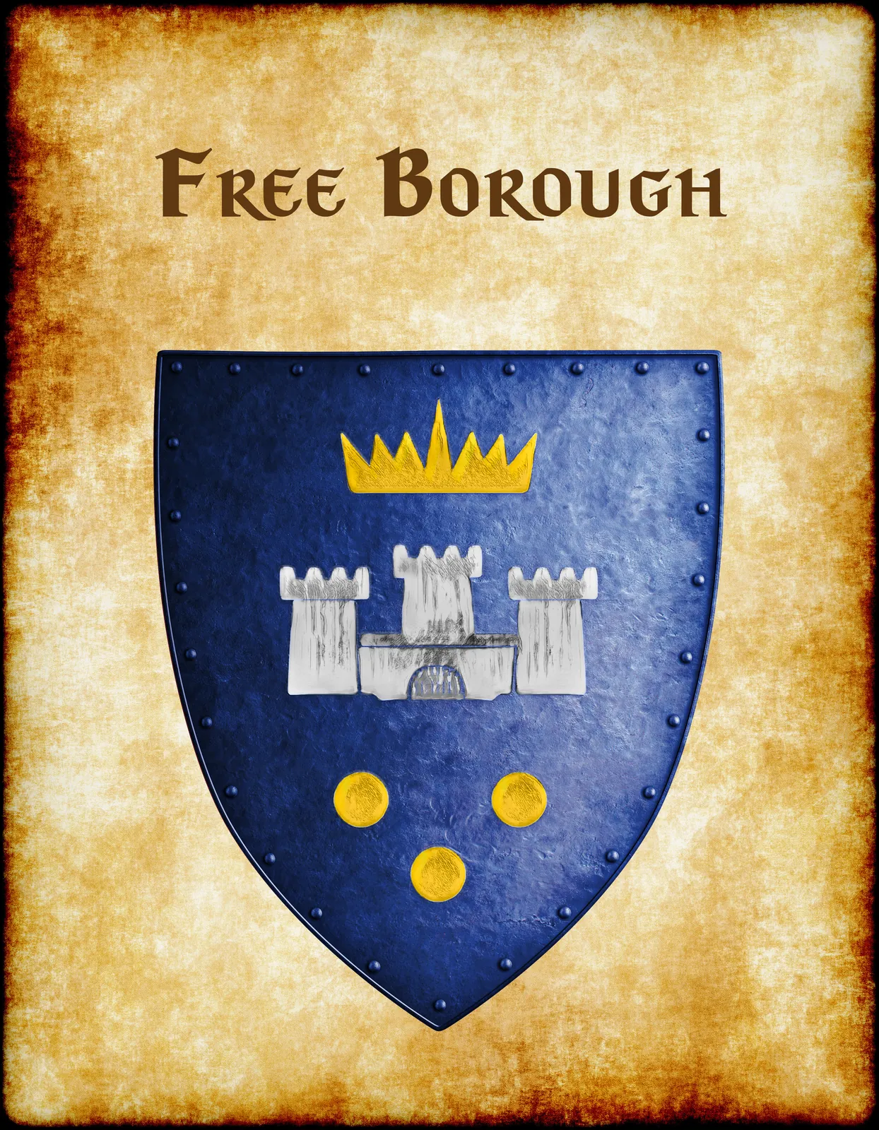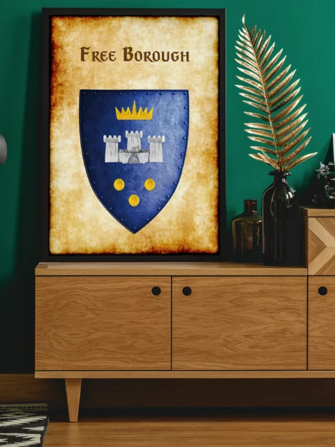 A silver castle with three towers dominates the deep blue field. This free borough Greyhawk heraldry canvas print captures medieval authority in digital detail. Notably, metallic rivets ring the heater shield’s weathered perimeter.