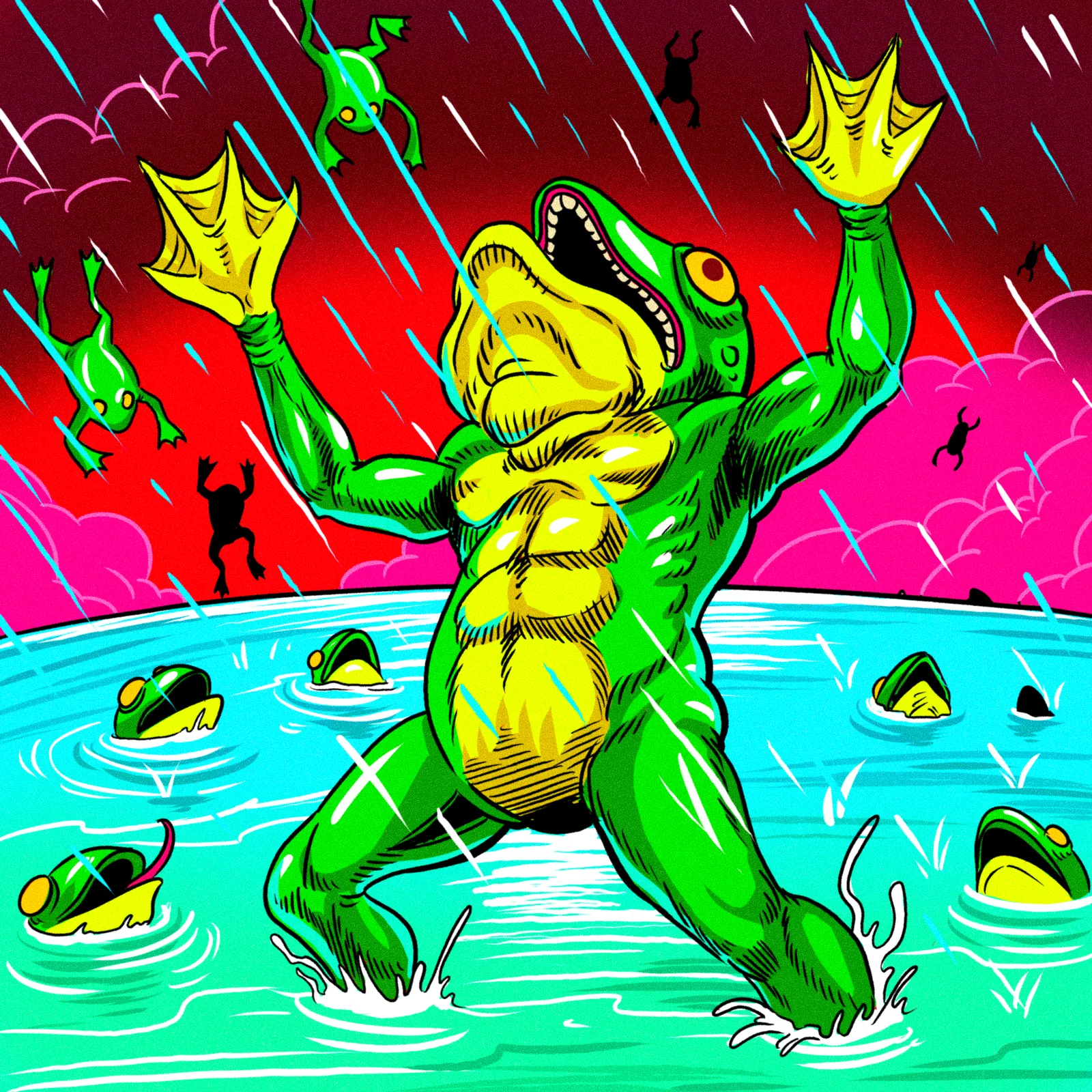 A massive anthropomorphic frog stands triumphant in shallow turquoise water, arms raised wide. This frog of fortune art trading card art canvas print captures Fabricio Vainer’s neon-saturated illustration. Notably, smaller frogs rain from a deep crimson sky alongside diagonal cyan streaks.