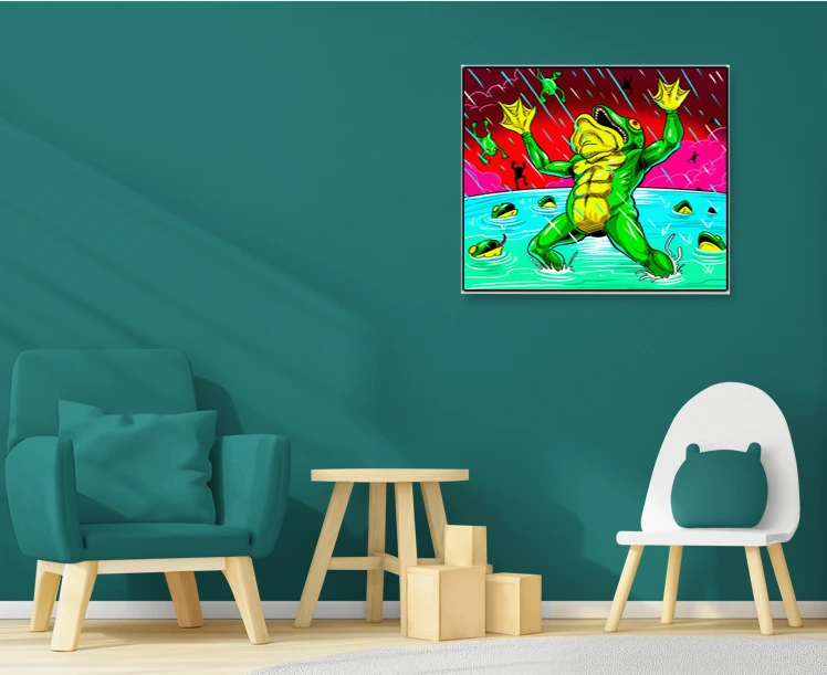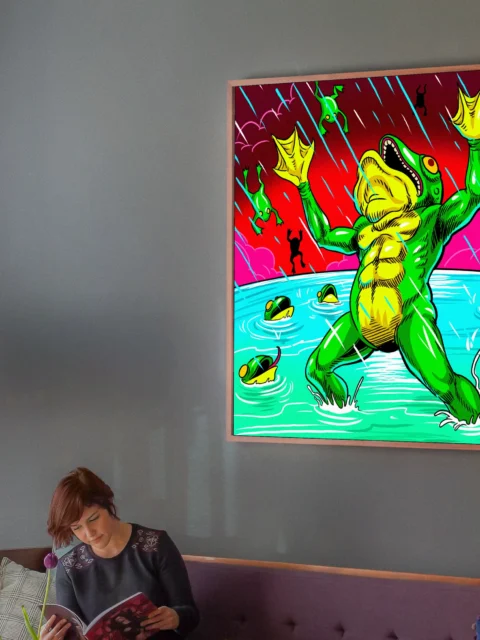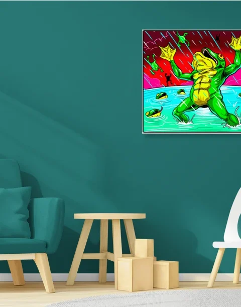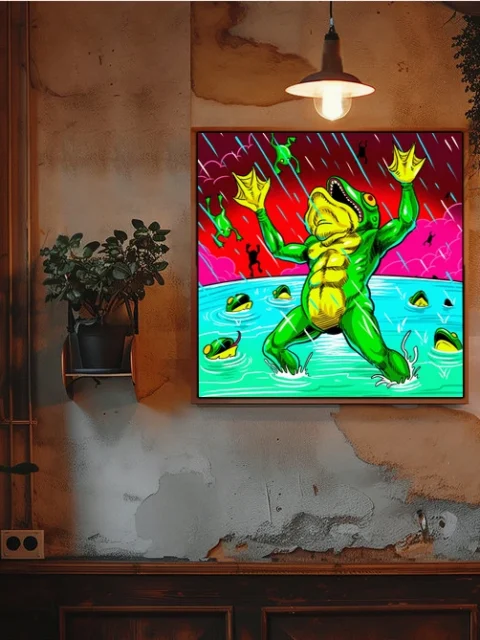 This belongs in a game room where humor and intensity coexist—amphibian devotees will grin every time. Additionally, creative studios benefit from the unhinged energy and saturated palette as visual fuel.
