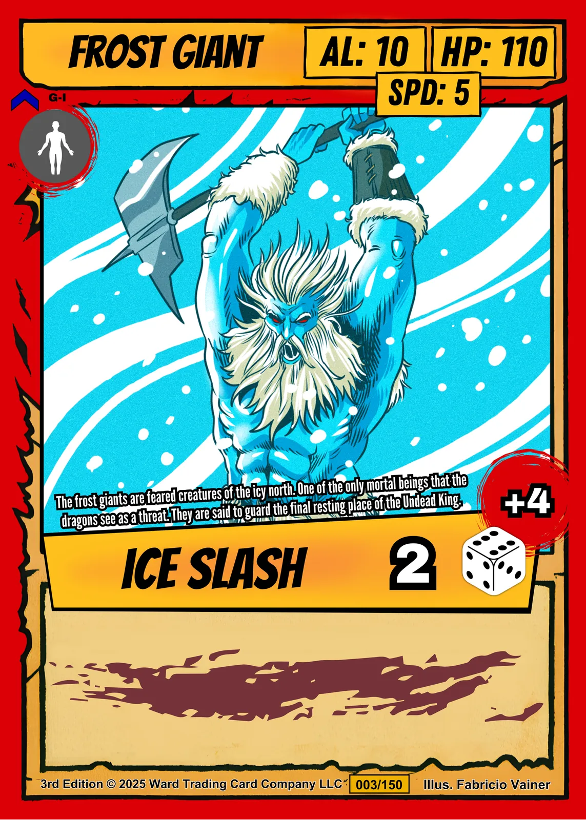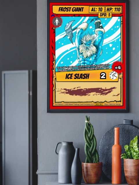 A towering frost giant raises his double-bladed axe against swirling arctic winds. This frost giant trading card canvas print captures Fabricio Vainer’s bold cel-shaded illustration from Ward TCG. Notably, diagonal streaks of ice and snow frame the giant’s fierce battle stance.