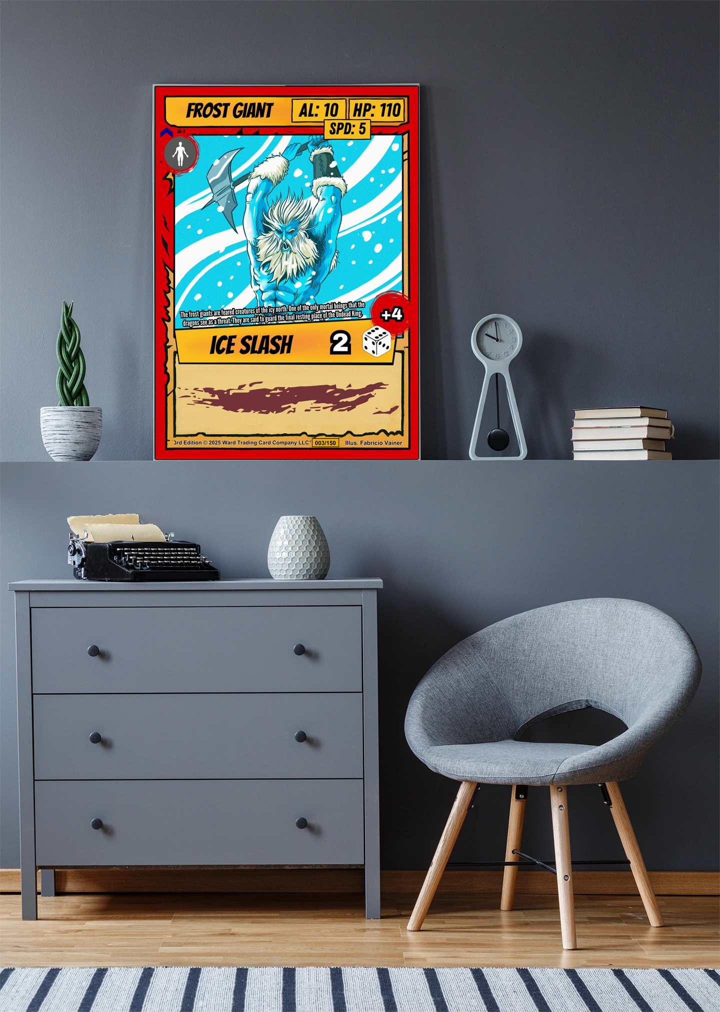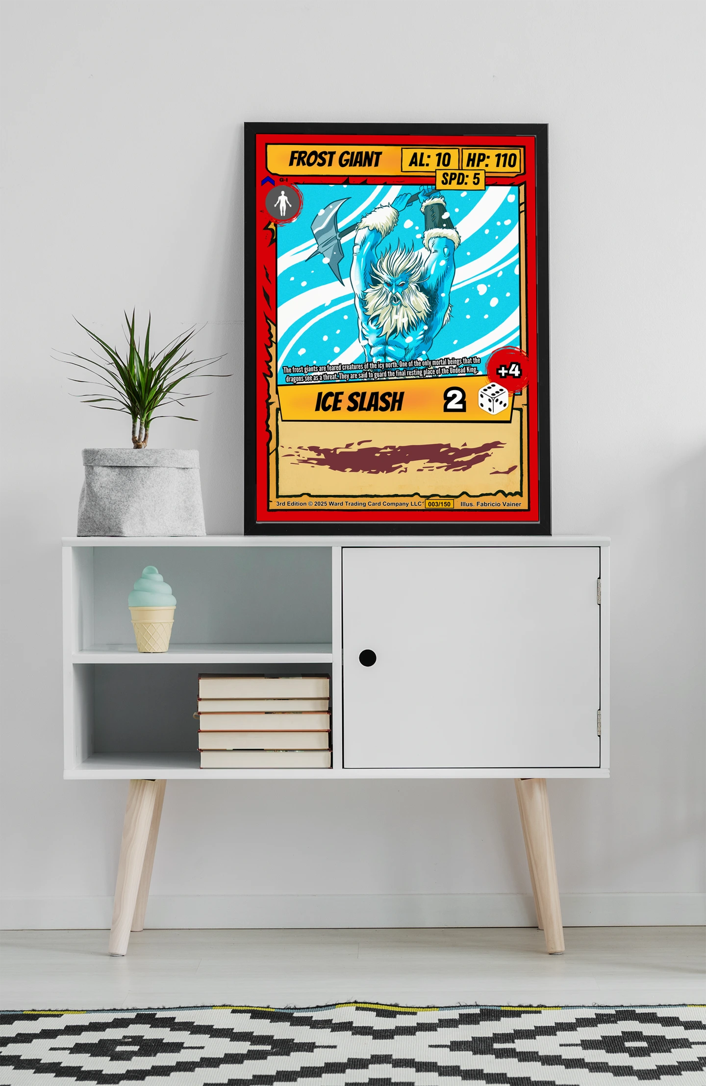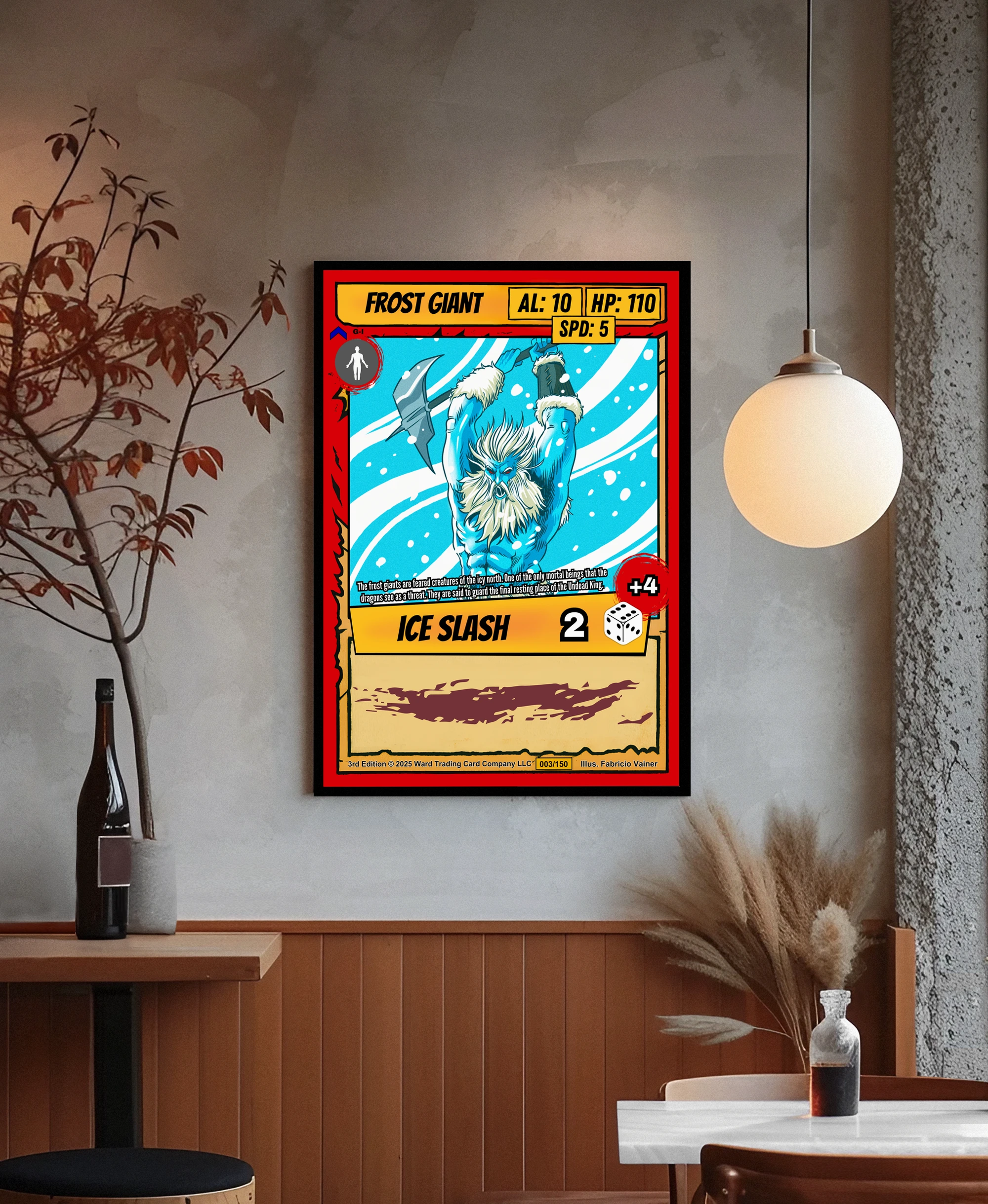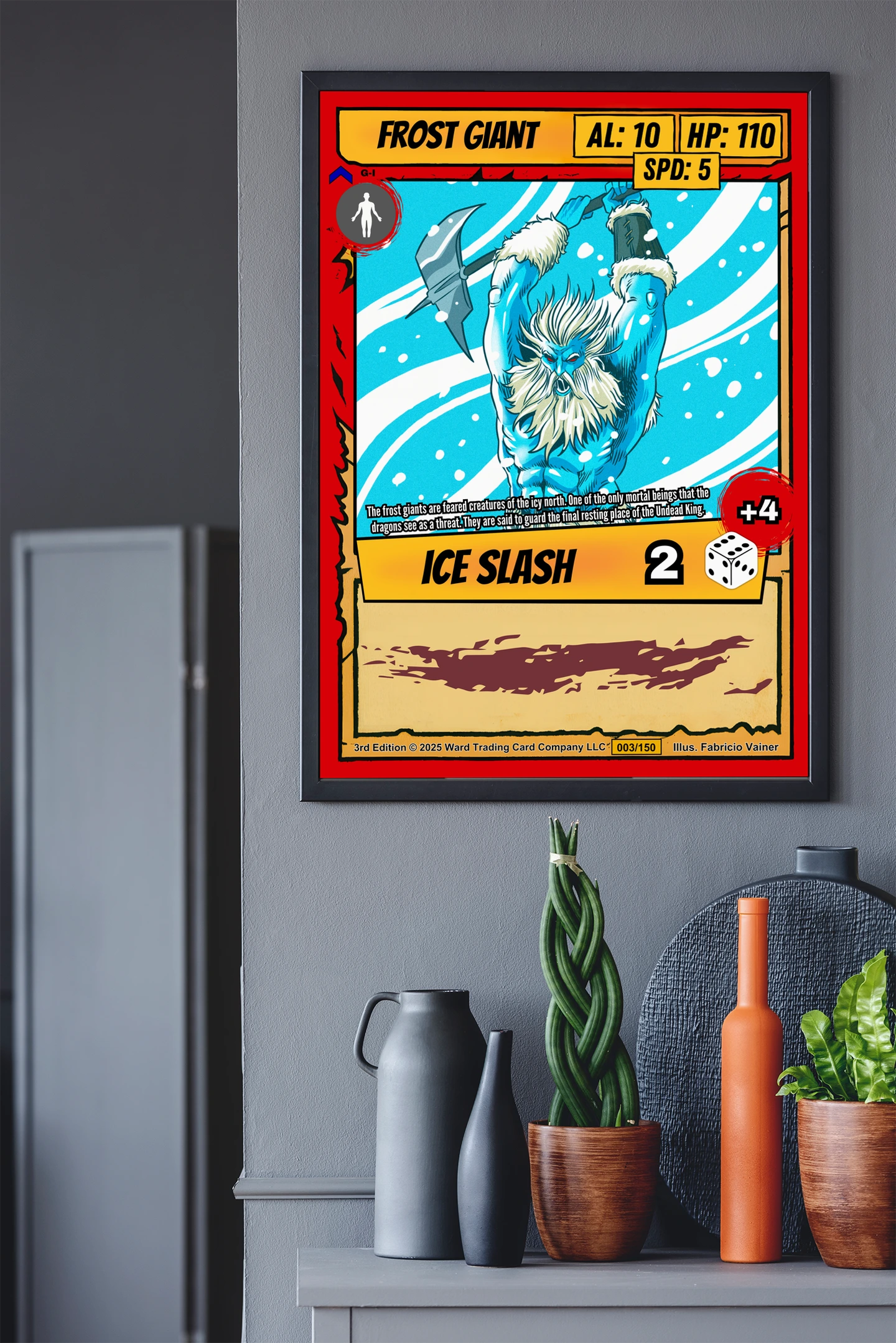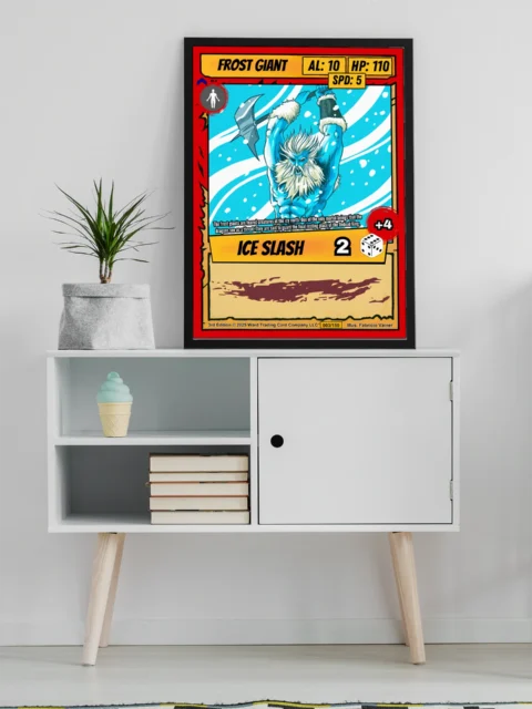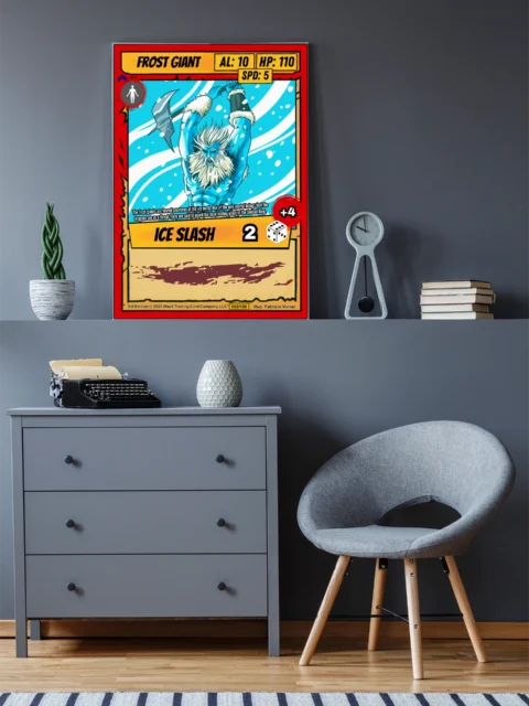 The giant’s scale reference silhouette reveals Vainer’s attention to creature proportions and threat assessment. TCG collectors and fantasy enthusiasts recognize this level of world-building detail immediately. Moreover, this frost giant trading card canvas print commands respect in any collection space.