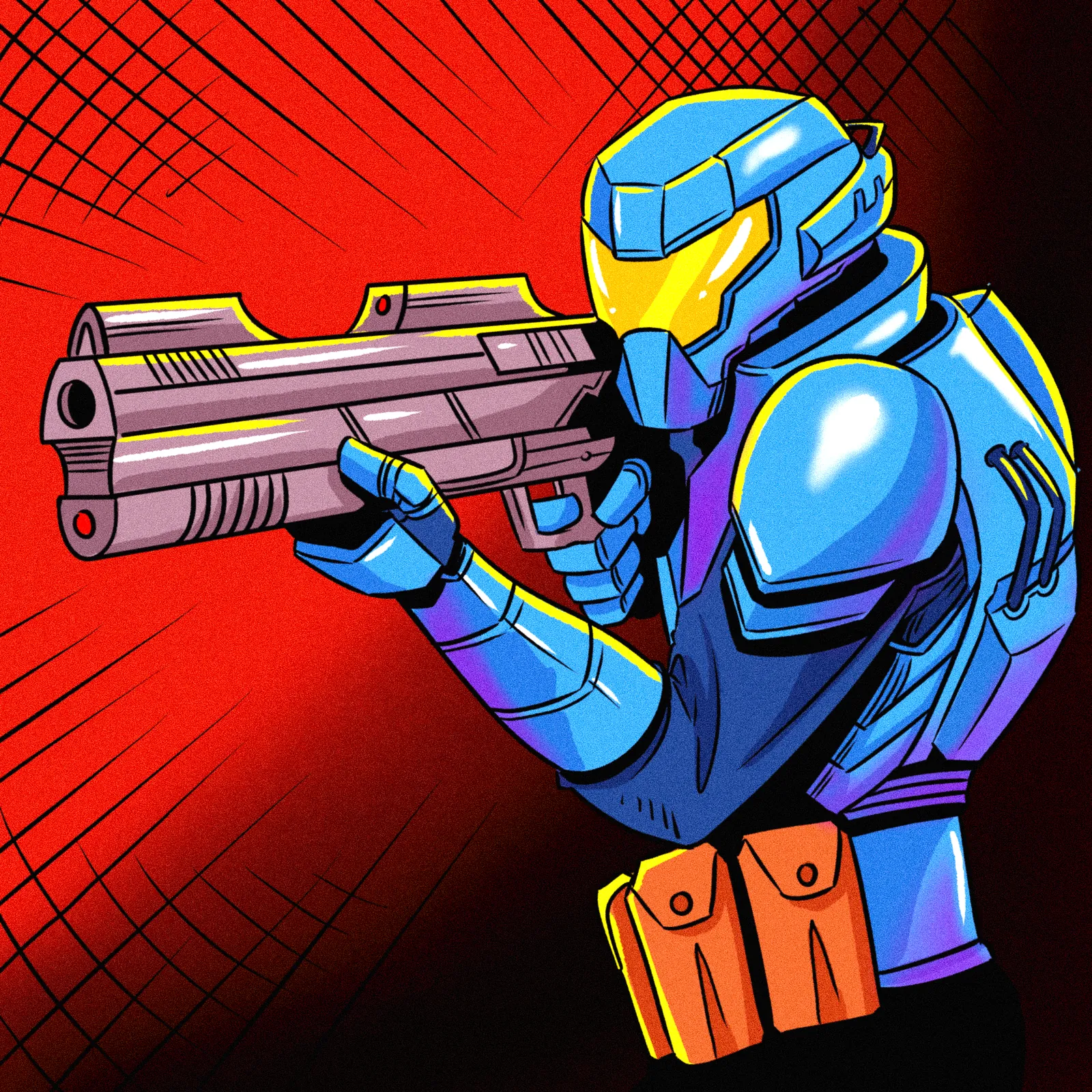 Additionally, the red gradient background shifts from vibrant crimson to near-black at the edges. Dark crosshatched linework creates depth behind the armored figure. Moreover, yellow accent striping contrasts sharply against the glossy blue plating.