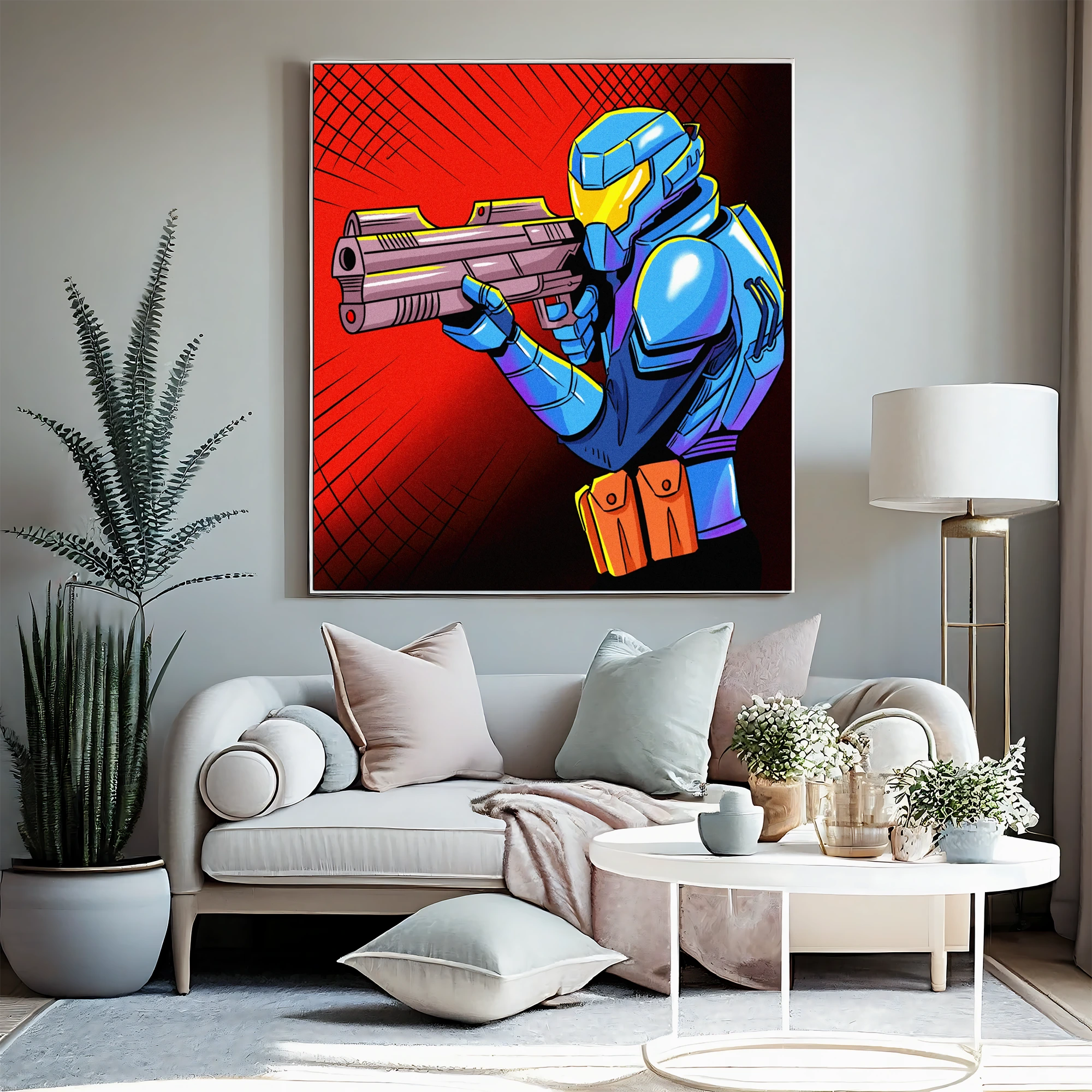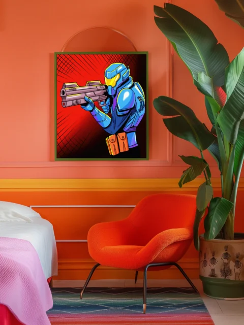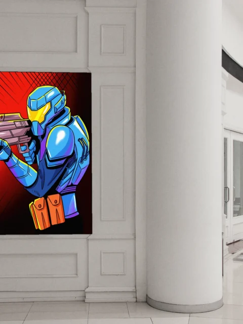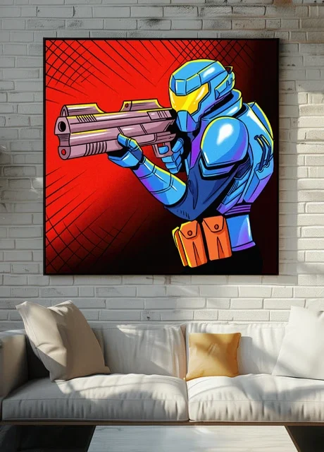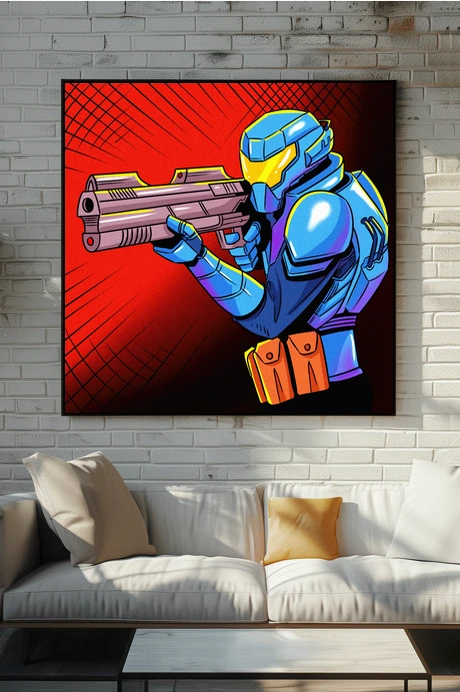On the wall, the direct weapon aim creates genuine confrontation at display scale. Ward TCG collectors and sci-fi armor enthusiasts gain a comic book aesthetic piece. This future warrior art trading card art canvas print delivers action intensity without borders.