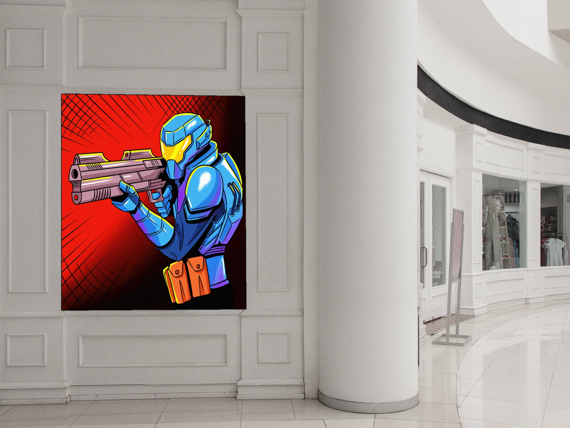 The bold red background and aggressive stance suit game rooms or creative studios focused on action genres. Additionally, the high-contrast palette holds visibility in well-lit collector display areas.