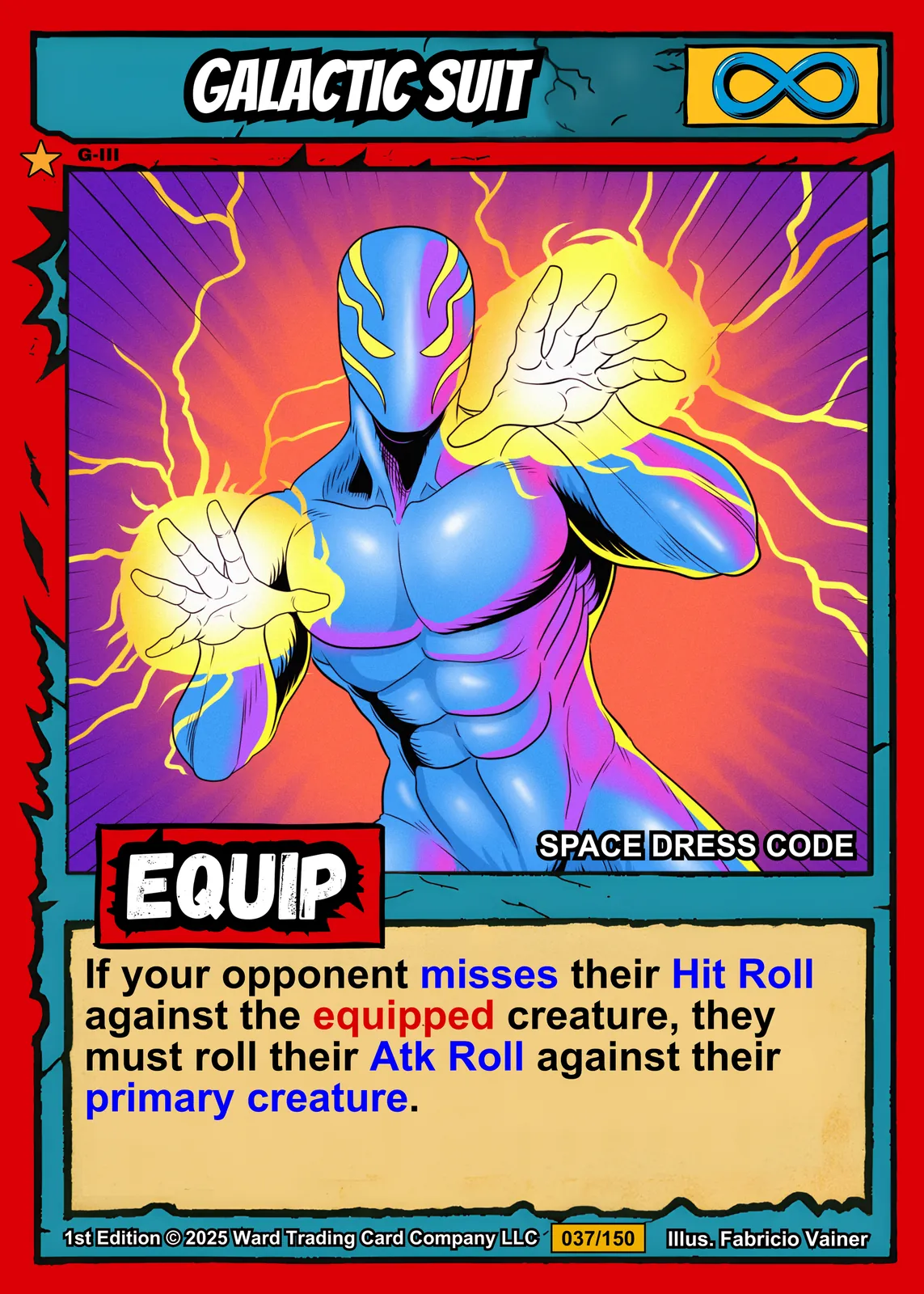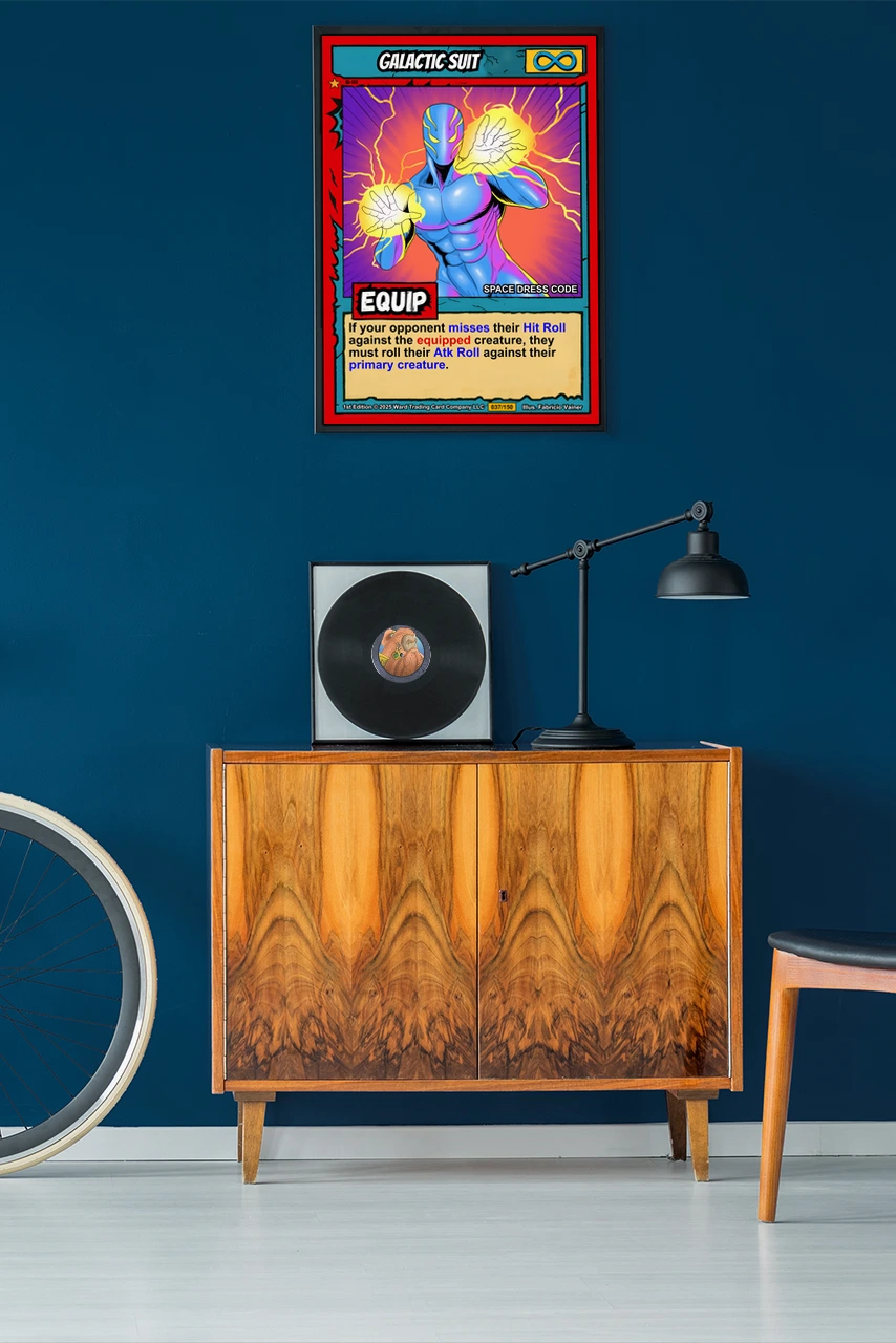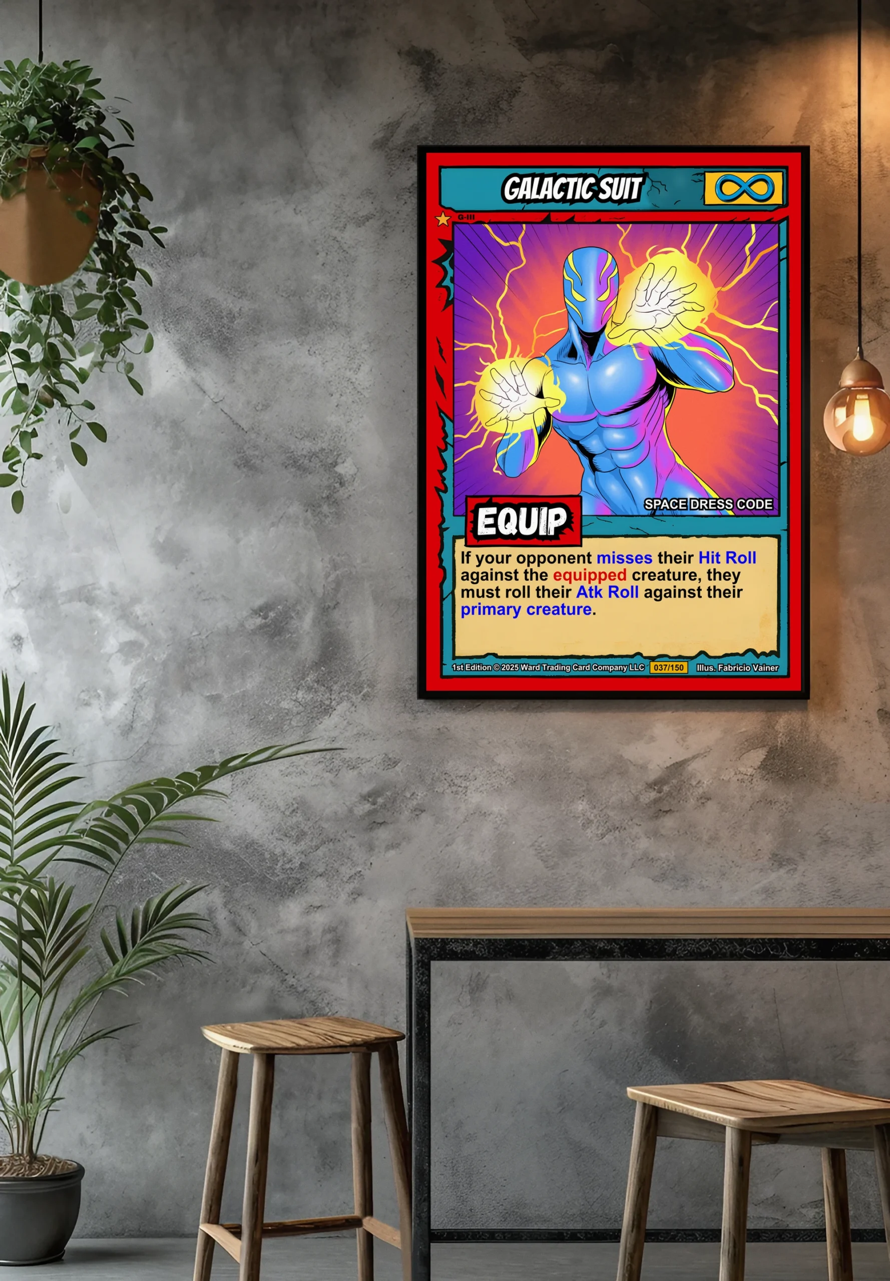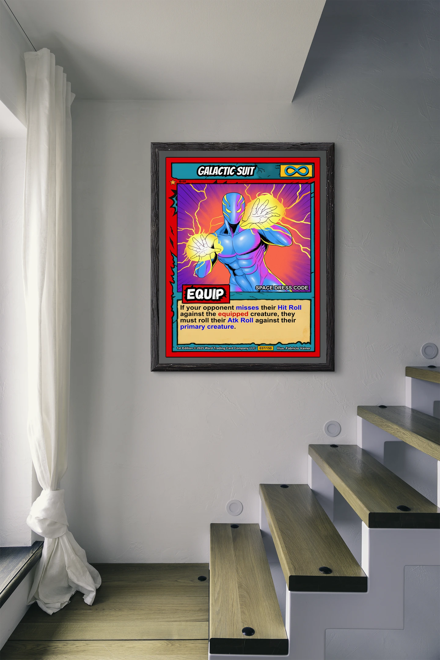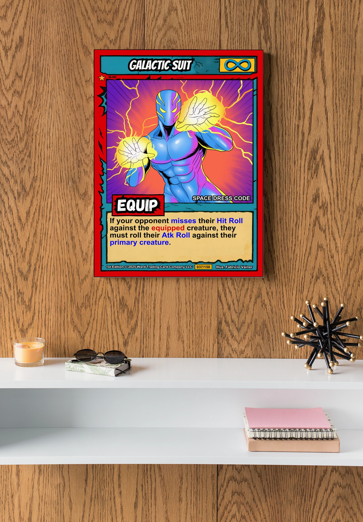 The comic book line work and cel-shaded coloring read clearly from across a room. Ward TCG collectors recognize the Equipment card type and Space Dress Code subtype immediately. This galactic suit trading card canvas print appeals to players who built decks around power-boosting gear cards.