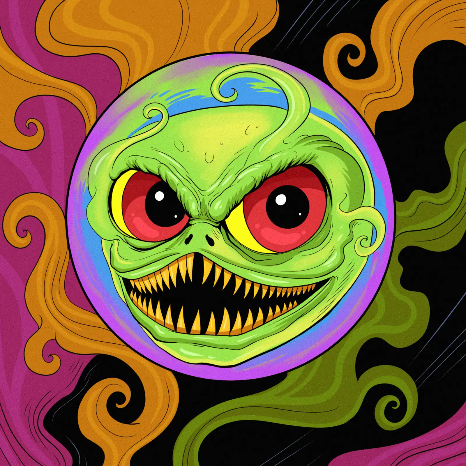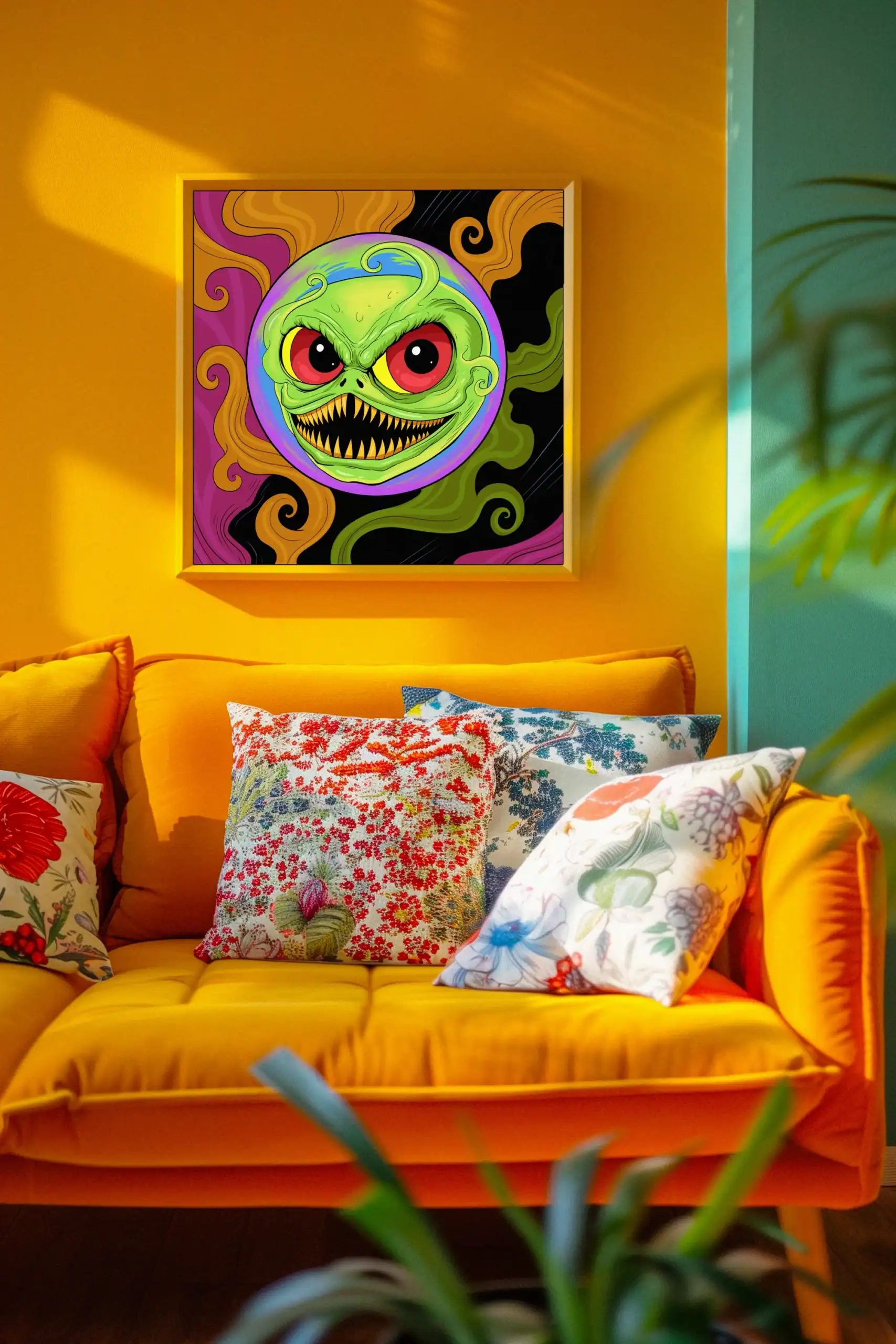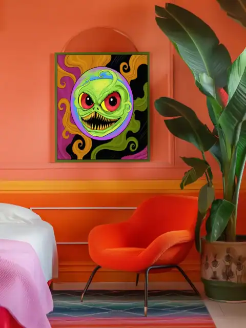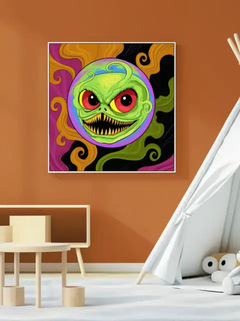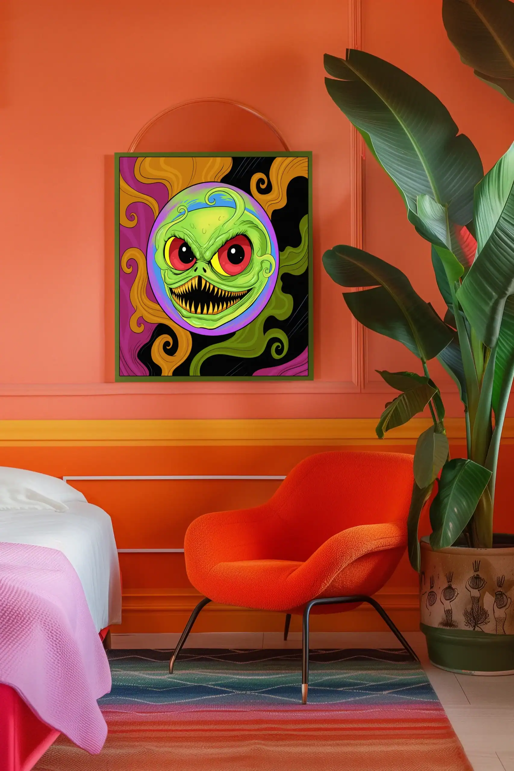 A spherical green creature with bulging red eyes dominates the frame. This gaseous horror art trading card canvas print captures Fabricio Vainer’s bold illustration. Notably, purple and blue energy swirls around the lime-colored beast.