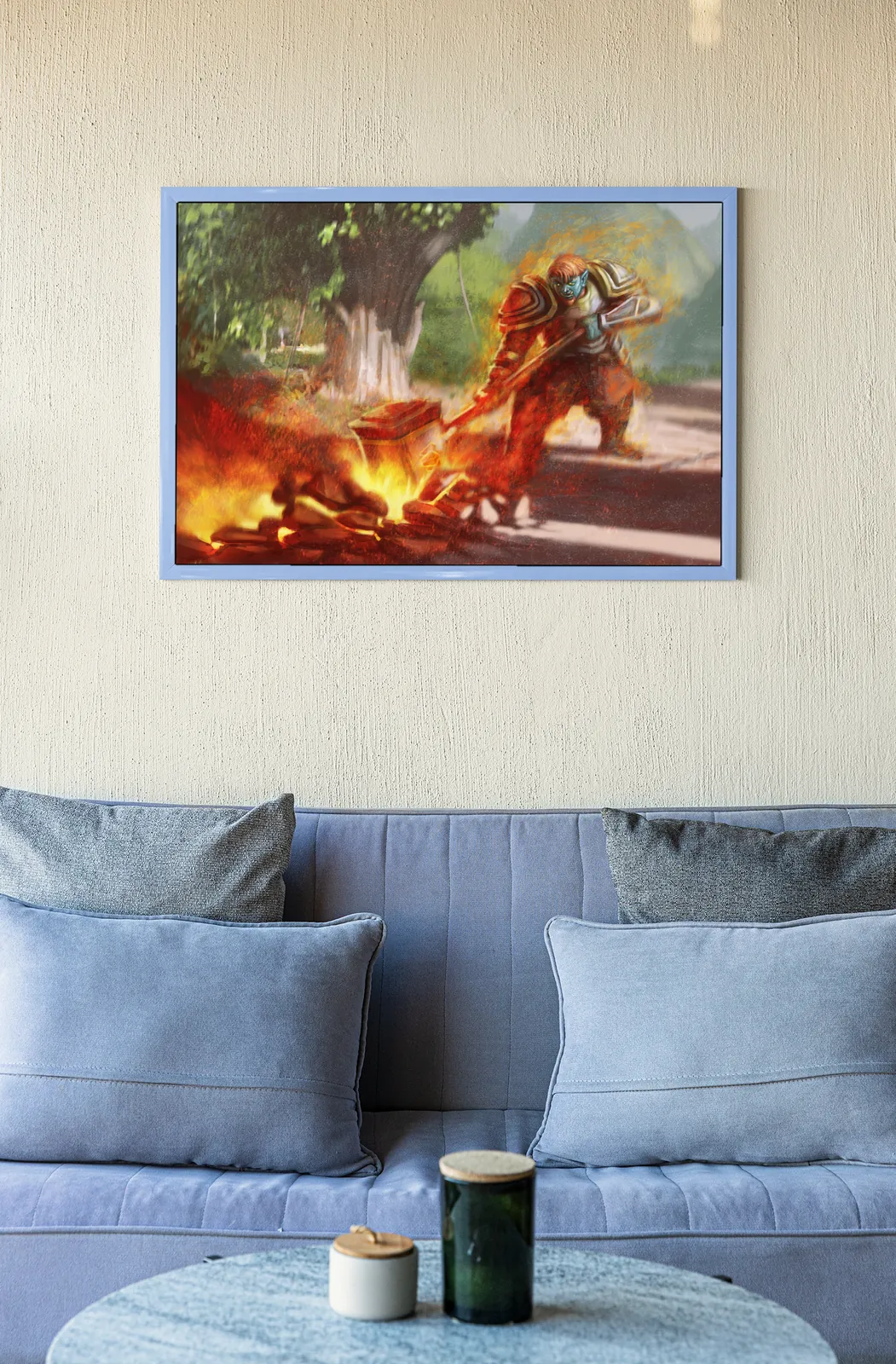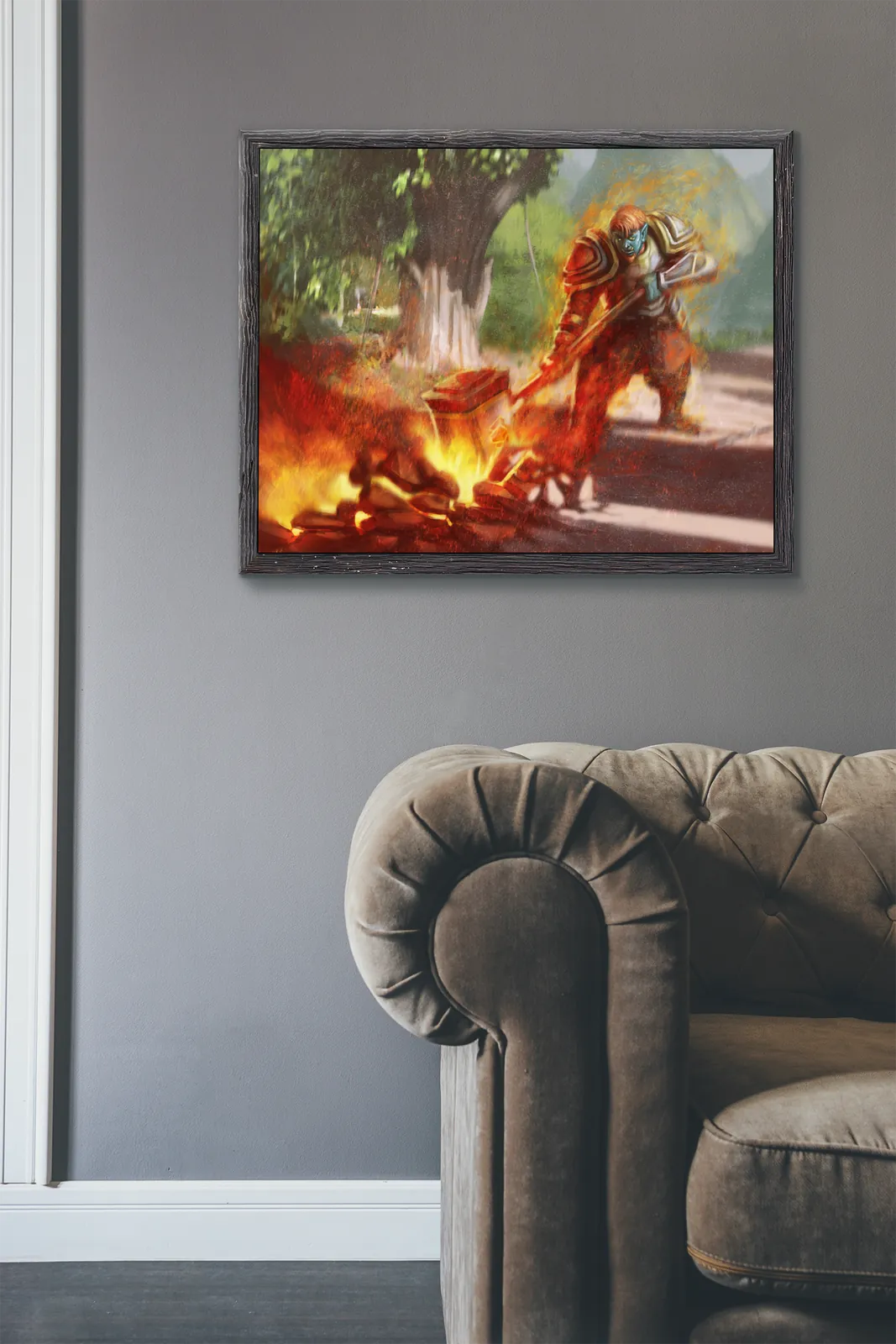 Finally, this art on canvas is produced for vivid color, sharp contrast, and lasting wall presence. Therefore, molten glow, armored textures, and flying debris remain bold at larger sizes. Above all, Gavel Smash Orc Paladin fine art canvas functions as collectible character art and a commanding focal piece for any fantasy space.